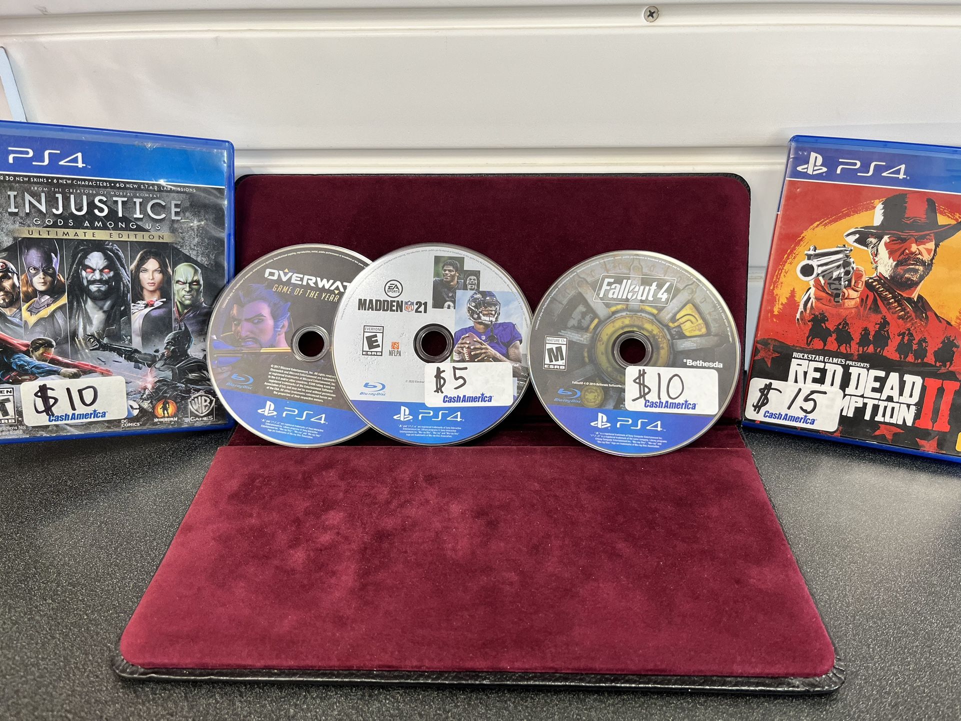 Like new Overwatch $5 Madden 21 $5 Fall out 4 $10 Injustice $10 Red dead redemption II $15