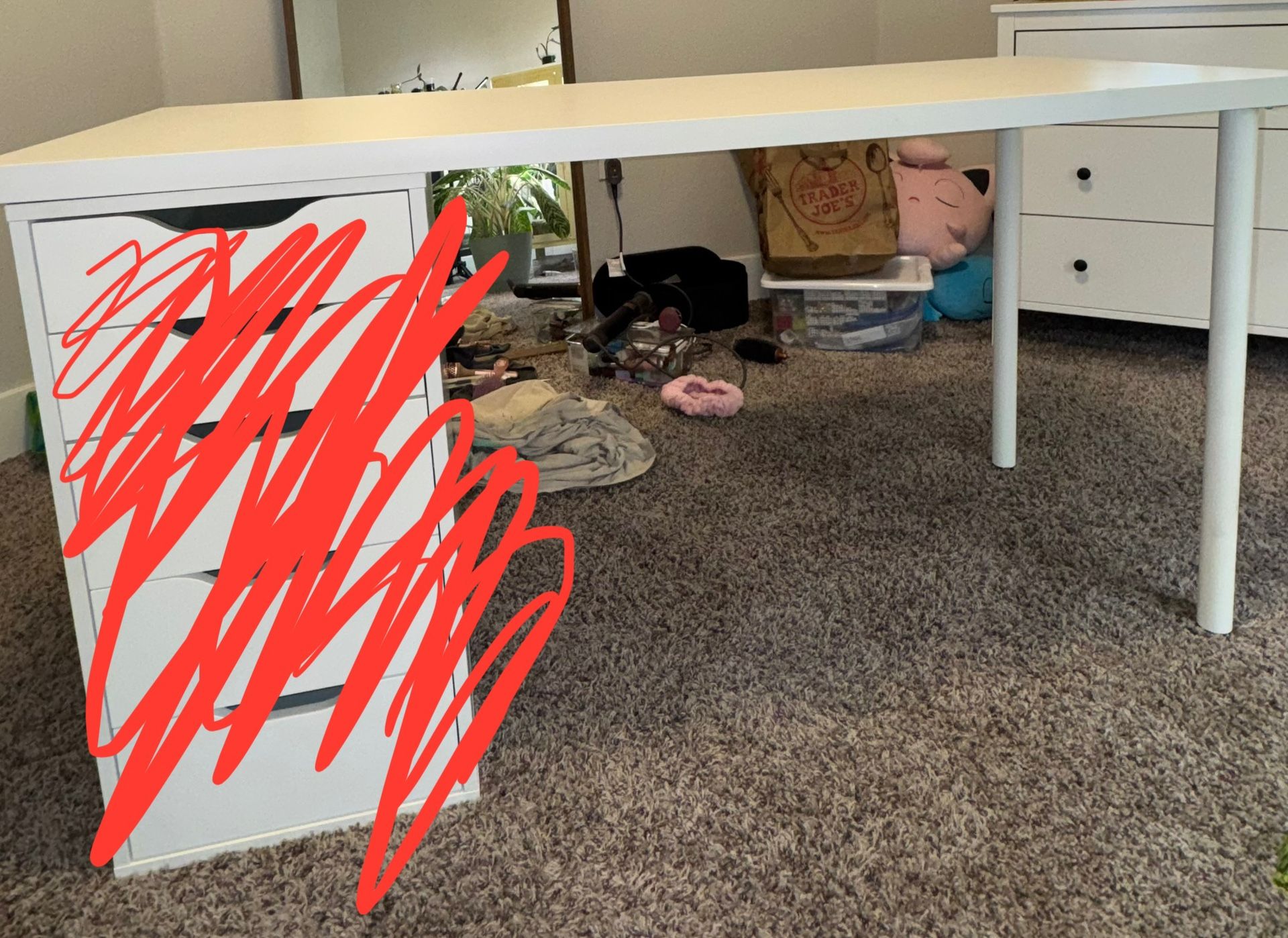 Selling part of an ikea desk that is no longer needed. Cabinet is NOT included. Table is 55 inches long 23 inches wide Comes with 2 white desk legs that are 27 1/2 inches tall. Additional 2 legs can be purchased via IKEA (refer to pictures). Refer to pictures for condition of desk. Normal wear is present. I can break down the desk to help fit in your vehicle. Pick up in Redlands.