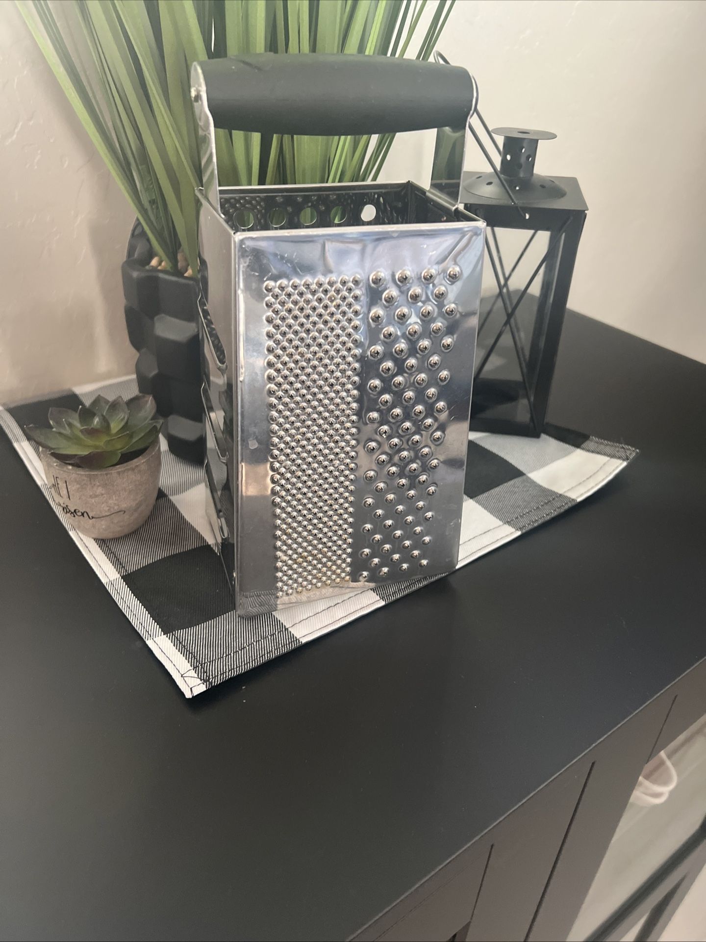 The Copco 9" Stainless Steel 4 Sided Box Cheese/Multi-Purpose Grater with Black Grip is a versatile kitchen tool that includes a cheese grater and box grater in one convenient set. The grater features a stainless steel blade with a grate type design, making it easy to shred cheese and other foods. The sleek silver color and dishwasher-safe design make it a practical and easy-to-use addition to any kitchen. This single-unit set also includes a comfortable black grip handle, adding to its functionality and usefulness for various grating tasks. Please note side, black piece missing see pictures for any imperfections or perceived imperfections