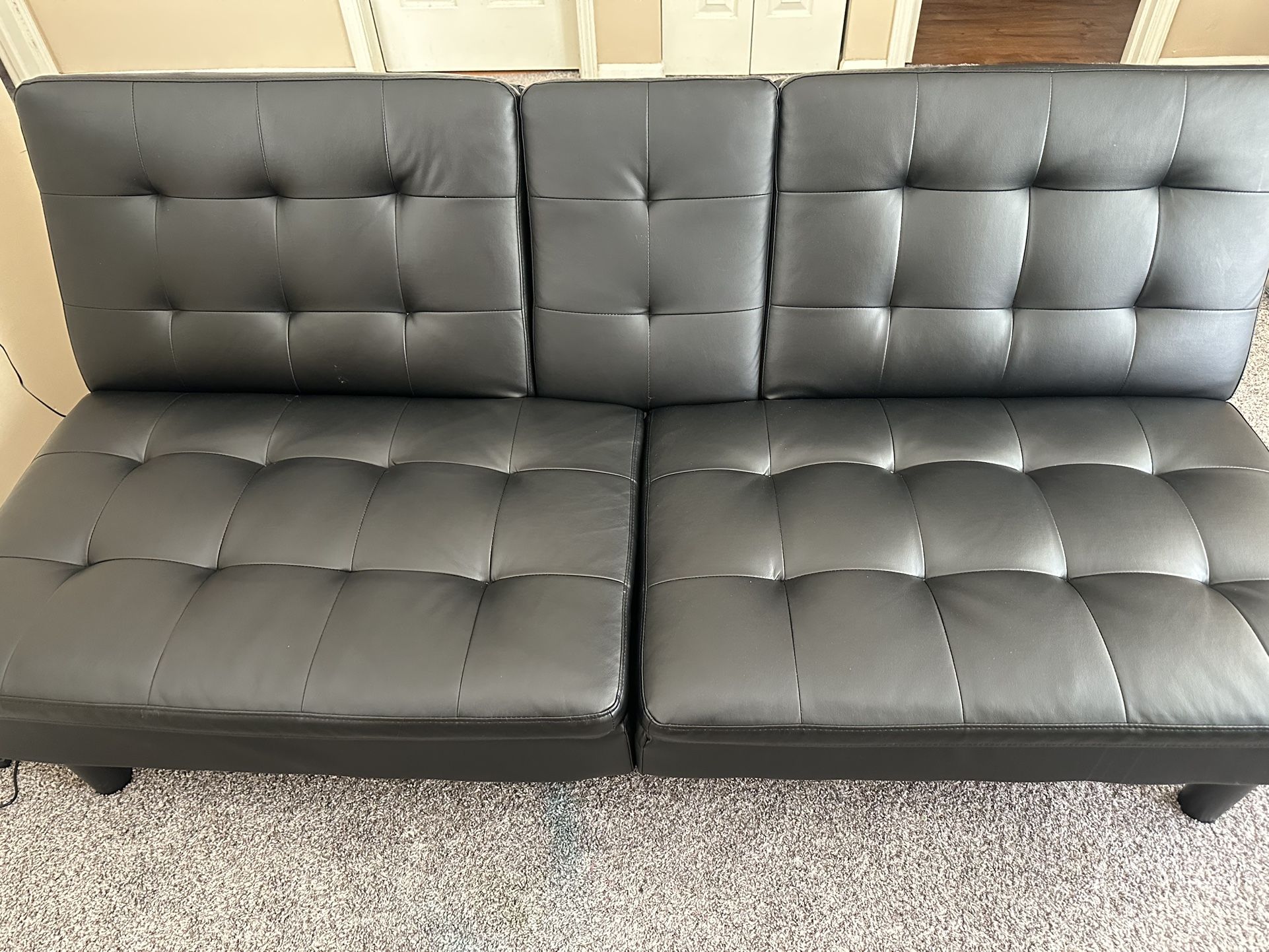Features: • Converts quickly from sofa to bed • Built-in center console with 2 cup holders (folds down when not in use) • Modern tufted design for a clean look • Easy-to-clean faux leather material • Sturdy and comfortable for sitting or sleeping Condition: Gently used, very good condition – no major wear or damage. Clean and well maintained.