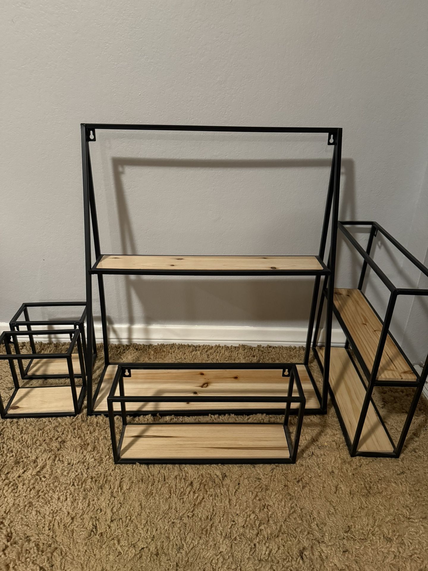 Wooden shelves with black hardware. 5 pieces included. Open to offers