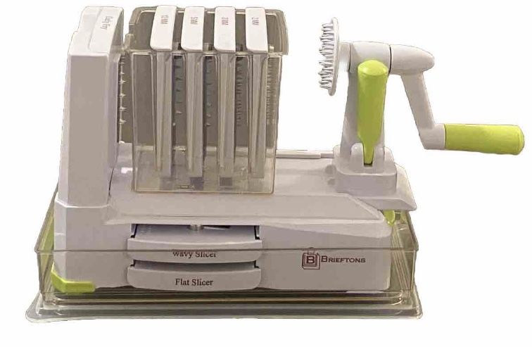 Specifications: • Materials: High quality, 100% BPA-free food grade, durable reinforced ABS plastic with ultra sharp stainless steel blades. • 7 interchangeable cutting blades: 2mm blade, 3mm blade, 5mm blade, 12mm blade, Curly Fry blade, Wavy Slicer blade, and Flat Slicer blade. • Blades’ case. • Instructions & recipe booklet. • Height: 7.5 in • Model: Brieftons 7-Blade • Length: 10.2 in • Width: 5 in • Weight: 2 Ib