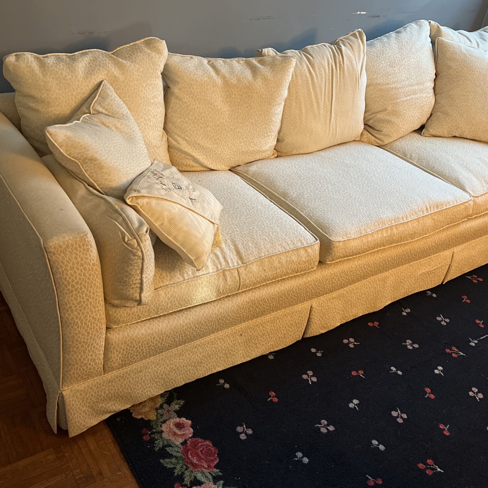 White sofa, 100” x 36” , in good condition besides one stitch coming lose on the back of one pillow. Very comfortable, just don’t need it