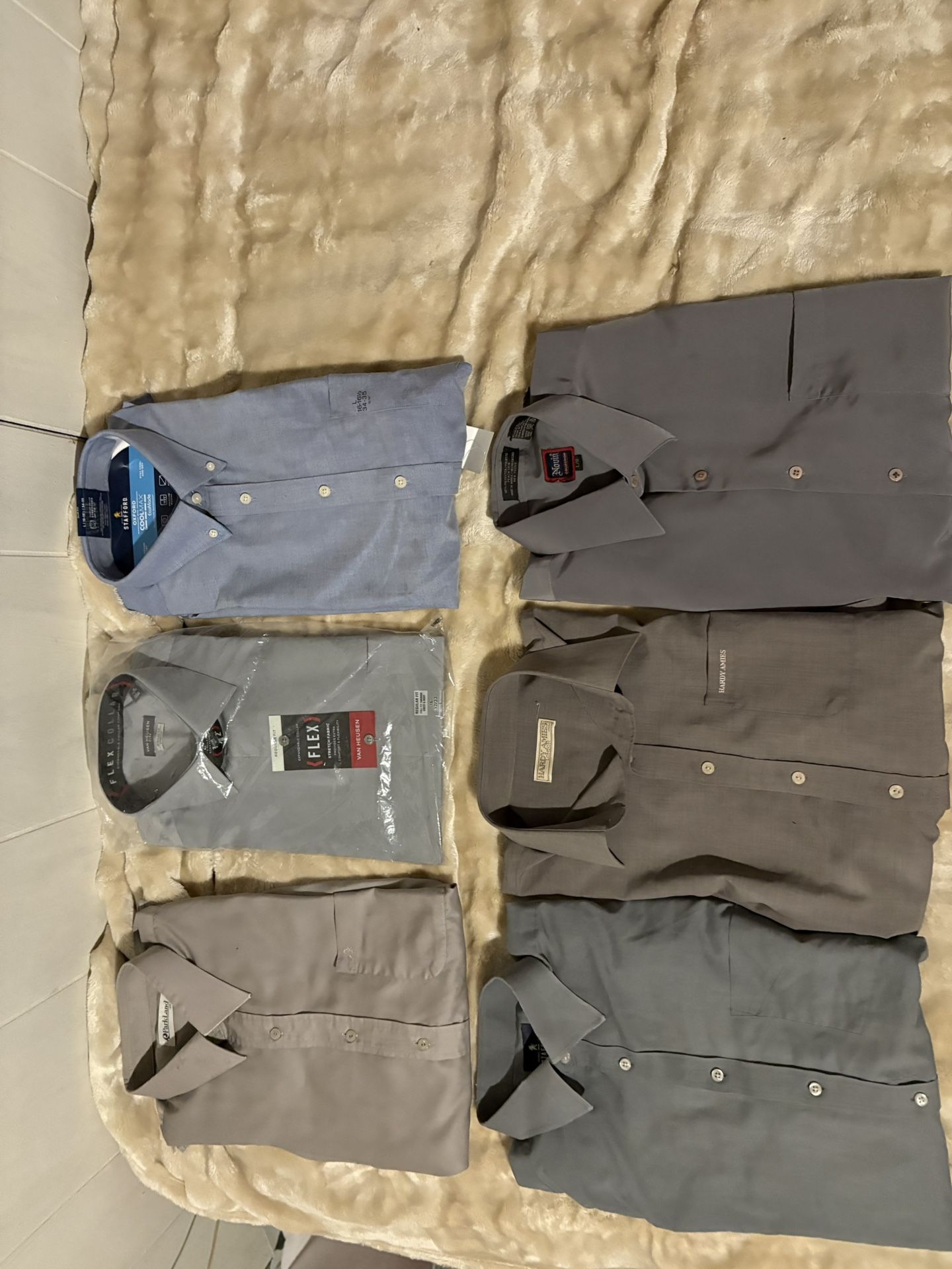 I have six button up dress shirts running at a size large. They are very new. Some of them even still have the tag on them. This is a couple hundred dollars worth of shirts here. Open two offers. But you must pick up I am not currently mobile.