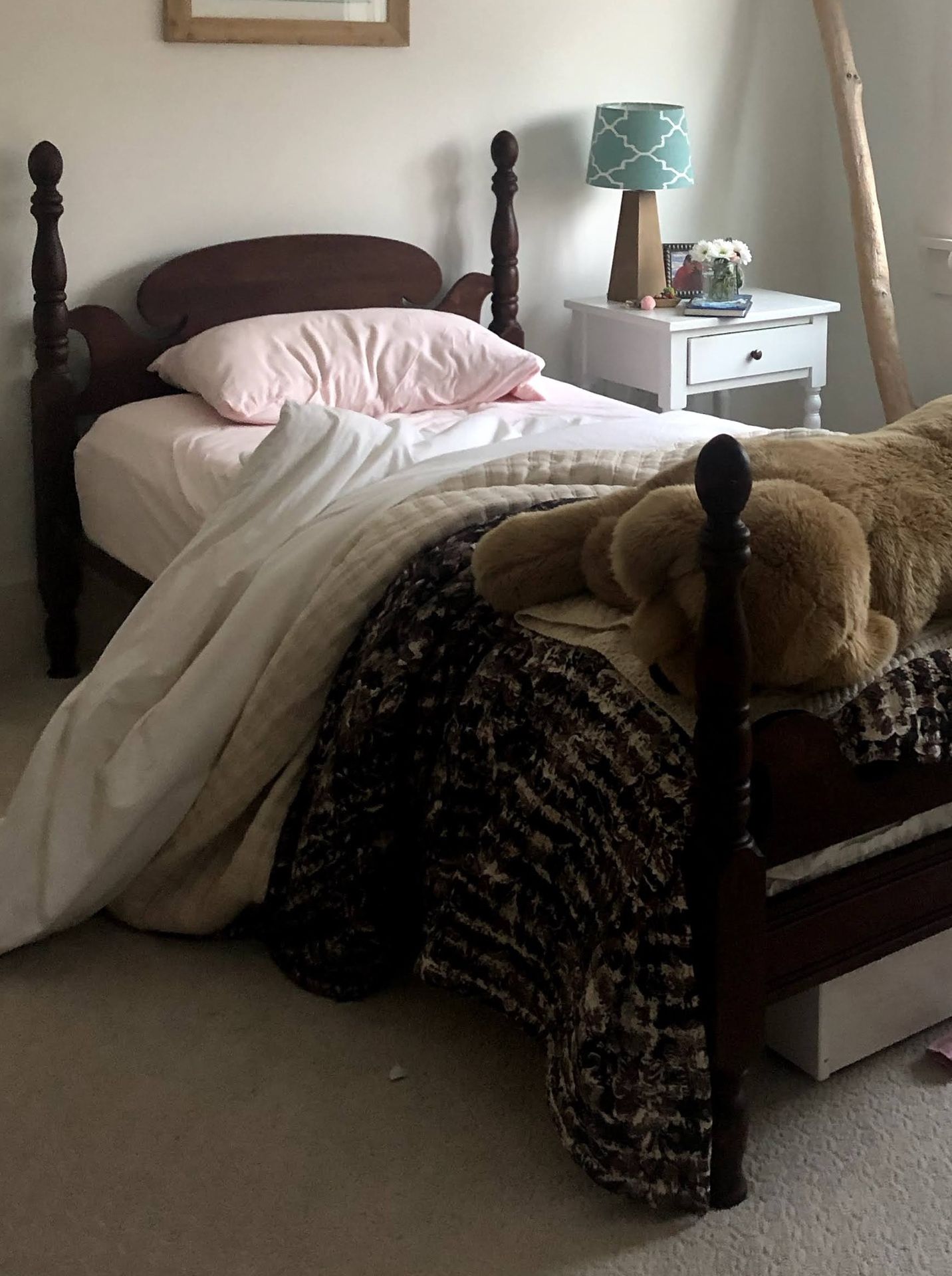 Vintage mahogany headboard and footboard with metal frame and wood slats. 42” wide x 41” tall (headboard), 34” tall (footboard)) x 82” long (approx) Like new twin mattress included