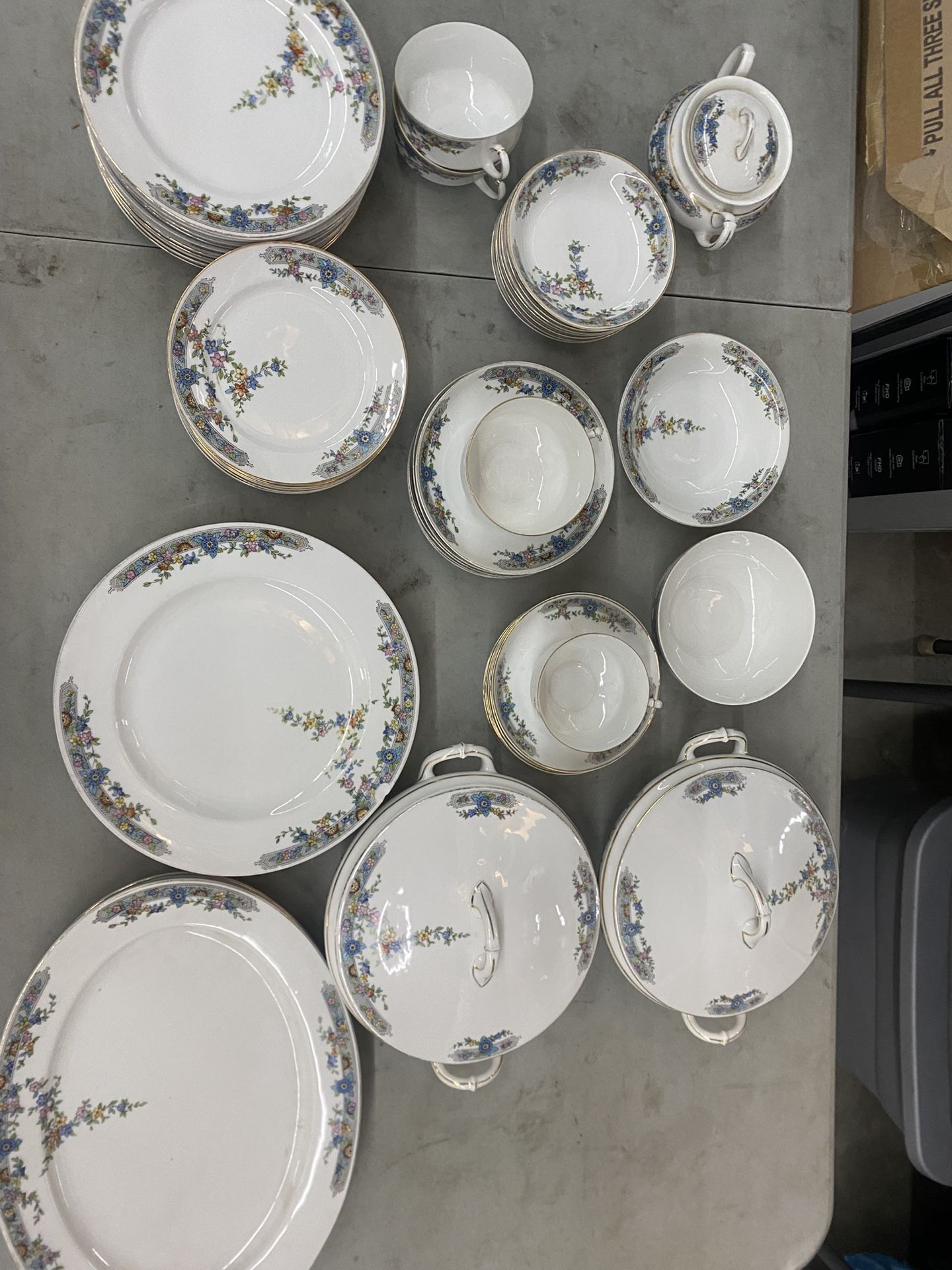 Not a complete set 2 large platters, 2 soup tureens with lids, 3 coffee cups, 1 tea cup, sugar bowl, 9 random bowls, 11 cup saucers, 5 dinner plates, 11 bread plates, 10 bread plates