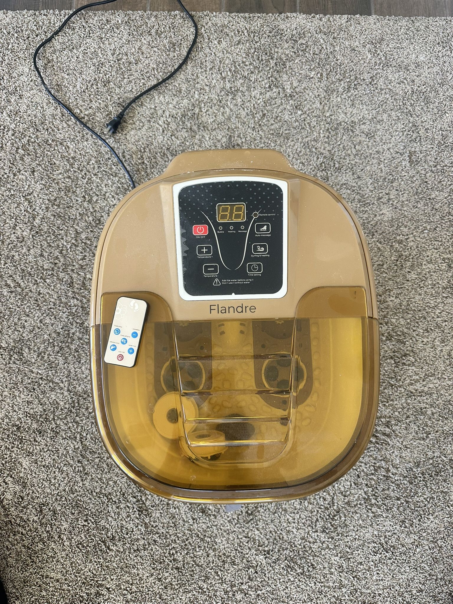 a Flandre foot spa, also known as the Dr Physio Electric Powerful Foot Spa Massager Machine. It's designed for relaxation and therapeutic foot care. Helpful information includes: Multifunctional Massage: Combines shiatsu, kneading, and rolling massage with warmth to target tense muscles and improve circulation. Acupuncture Point Massage: Massages acupuncture points to stimulate blood circulation and relieve stress. Customizable Settings: Features push buttons to control temperature and bubbles. The temperature can be adjusted between 35 and 48 degrees Celsius. Safety Features: Includes an automatic shut-off timer (60 minutes) and anti-slip feet. It also has an IPX4 waterproof rating. Capacity: The water tub has a maximum capacity of 5.5 liters. Portability: Lightweight and easy to carry. Benefits: Helps relieve pain, reduce stress, improve circulation, and soften skin. Digital Display: Allows monitoring of the massager's performance. Pick up only