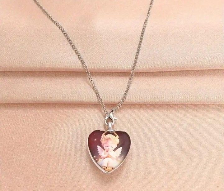 Cute Little Praying Baby Angel Heart Silver Tone Necklace