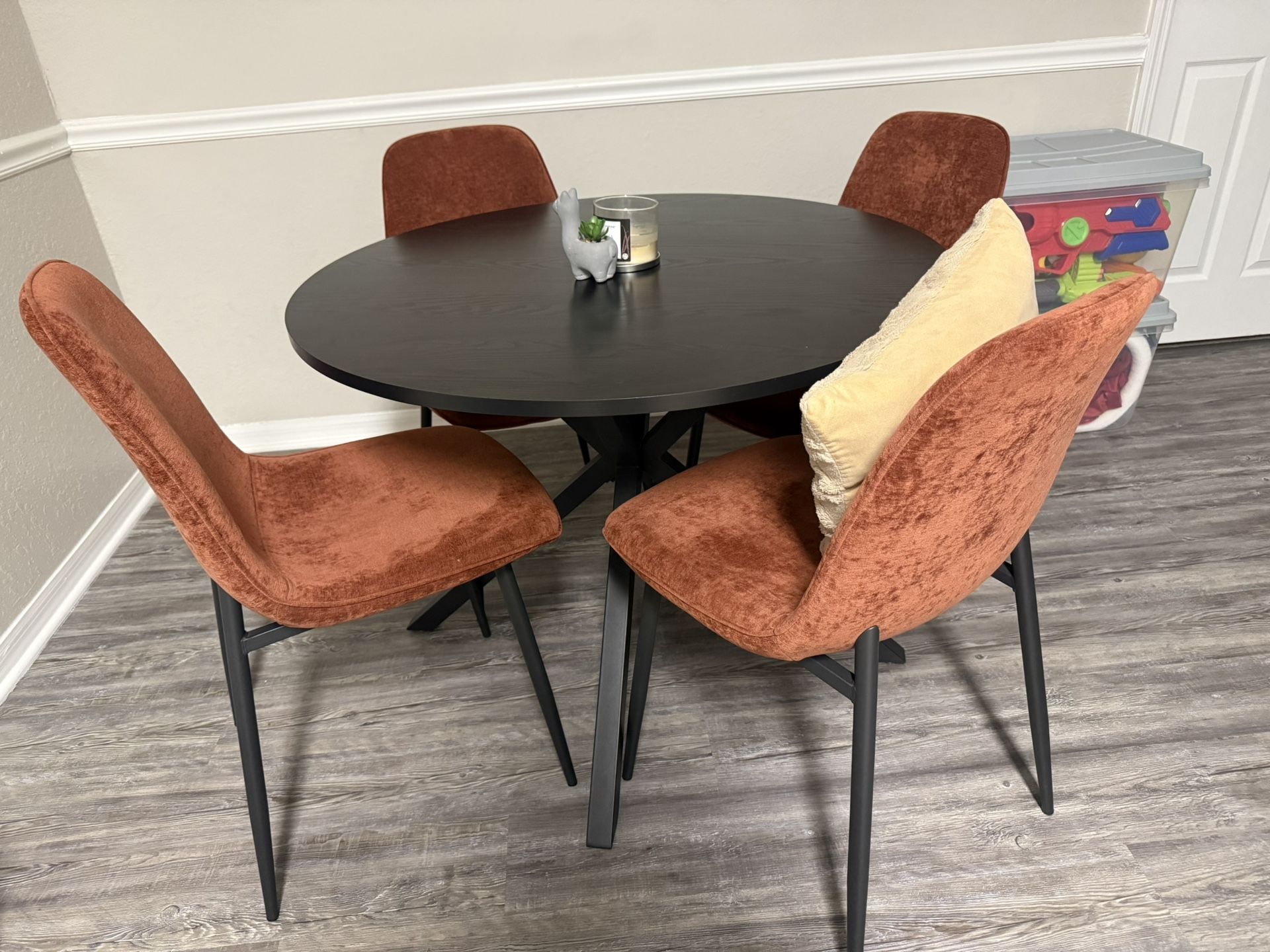 Selling a stylish dining set in great condition. Round matte black table with a sturdy metal base and four soft velvet rust-colored chairs. No stains, rips, or wobbling. Super comfortable and perfect for apartments or dining rooms. Details: • Seats 4 • Velvet rust/terracotta chairs • Metal legs • Modern look • Smoke-free home Pickup Only (in Brandon, FL) Price: $250 Cash only