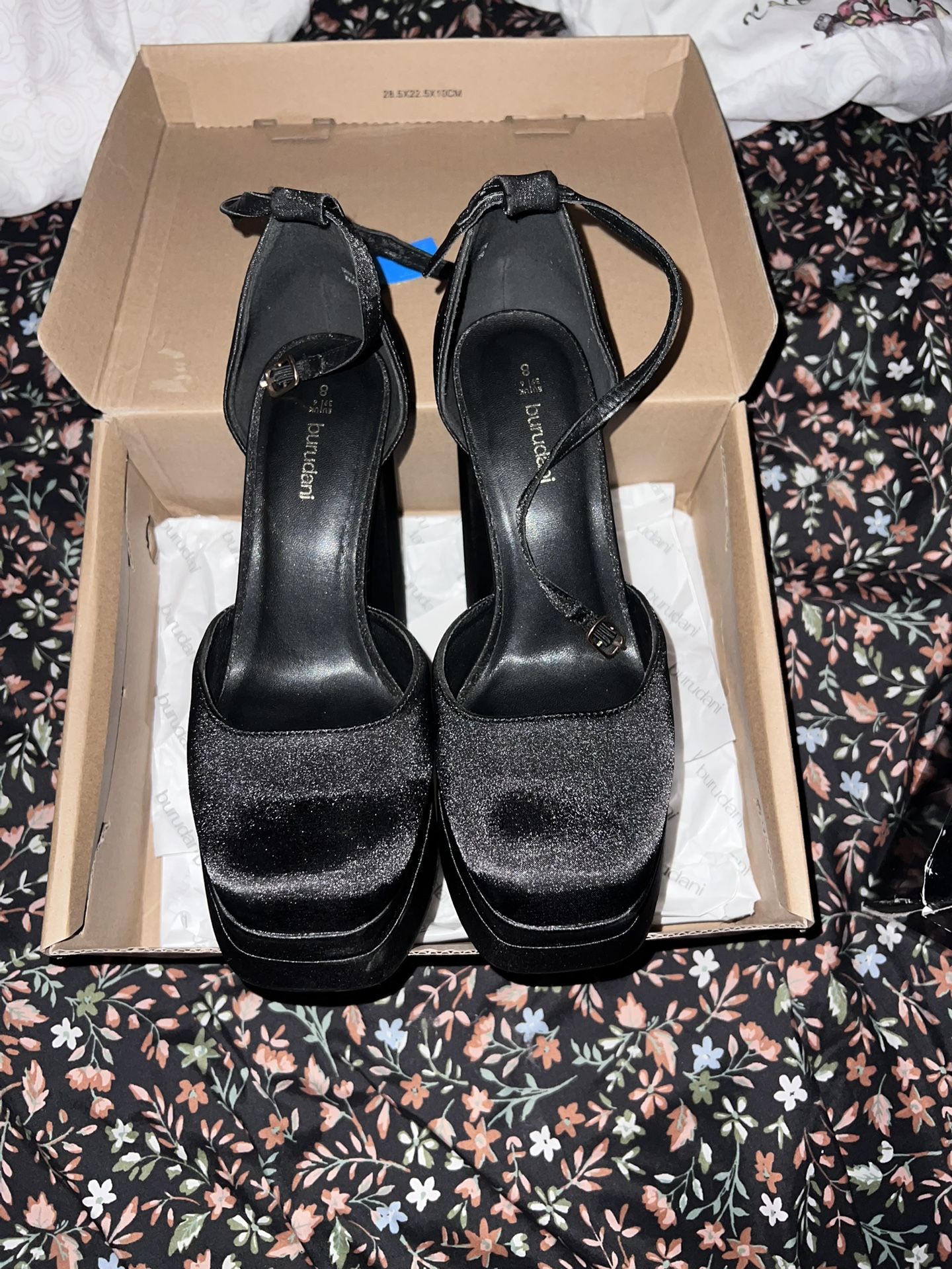 NEW IN BOX. Super high platform black high heels. Cushion padding in sole, great for wearing them a long time. Perfect for going out. Size 8 women’s