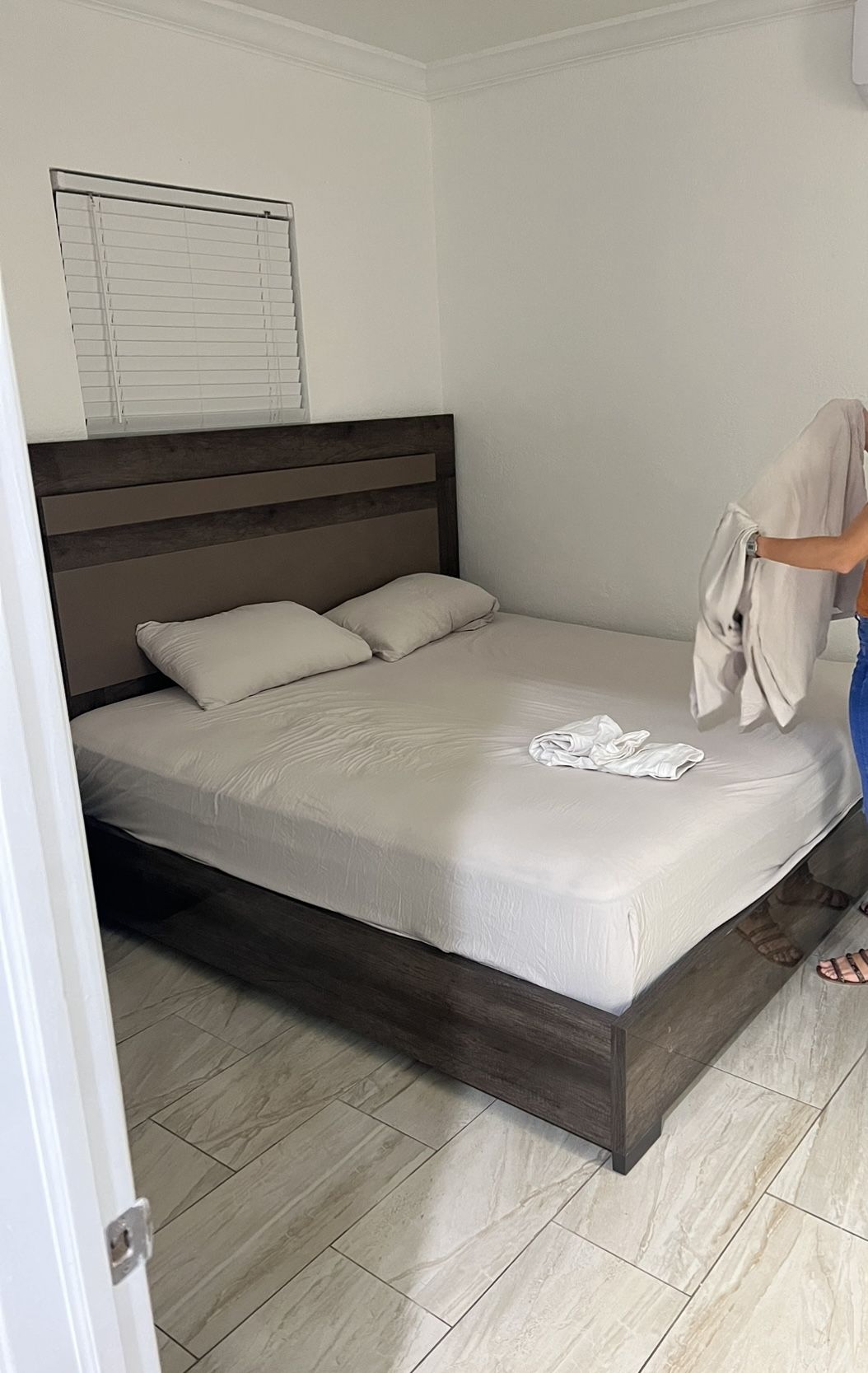 King bed with mattress 1 night stand and a dresser and a matching little bar