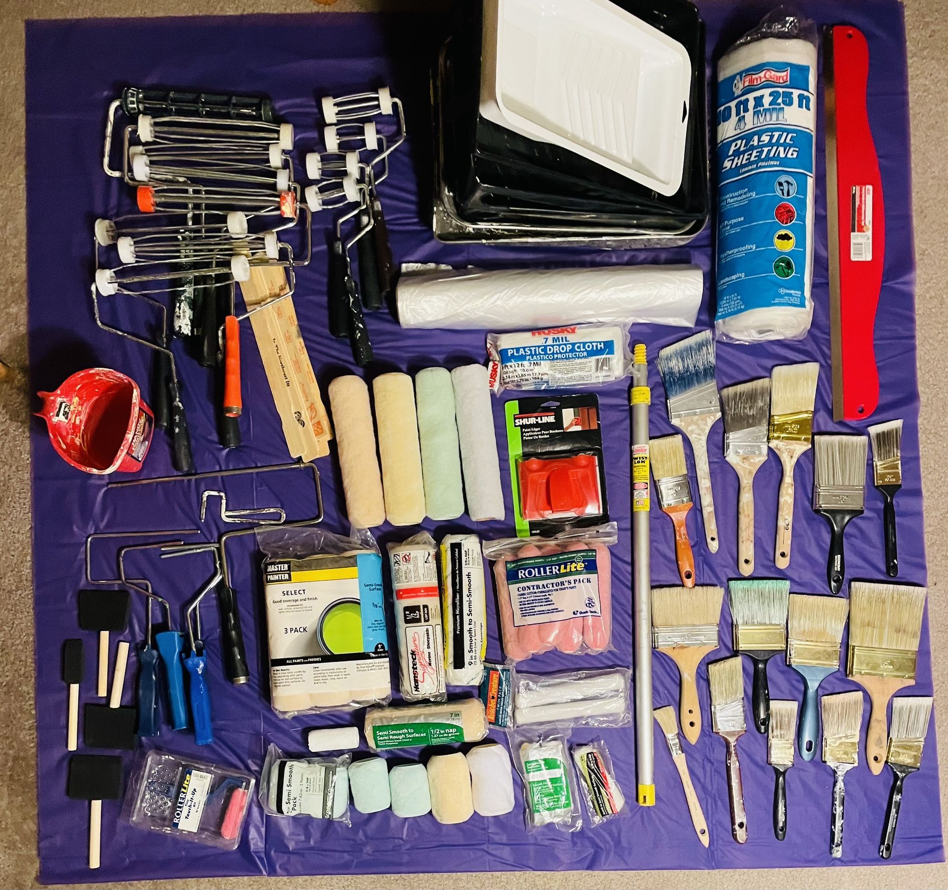 Paint supplies include: new & used 8-9” rollers 1-4” roller 3-3” rollers 1-11” heavy duty mini roller 1-6 1/2” mini roller 3-3” mini rollers 1-1 1/2” mini roller Roller Lite Touch-it-up kit 9-9” roller covers 1-7” roller cover 4-3” roller covers 2-4” roller covers 8-6 1/2” mini roller covers 3-4” mini roller covers 32oz Handy paint cup Shur-line paint edger Twist Lok extension pole 24” stainless edge paint guide Film-gard 10’x 25’ 4mil plastic Roll of .35mil painters plastic Plastic drop cloth 9’x 12’ .7mil Misc. paint trays Misc. brushes