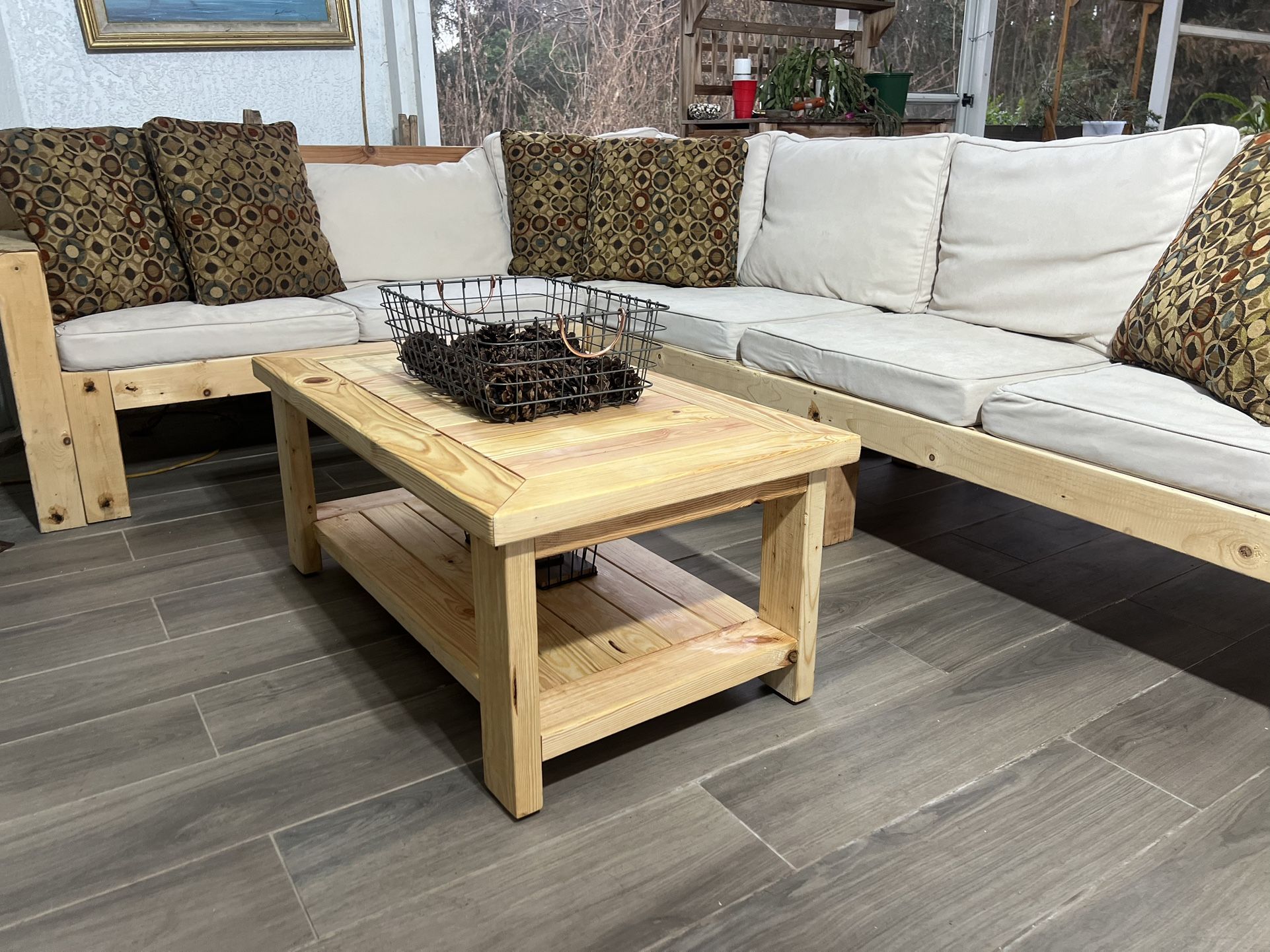 This coffee table was built by hand from solid 2x4 lumber, carefully cut, assembled, sanded smooth, and finished with a natural protective stain that enhances the wood’s character and warmth. At 42” long, 24” wide, and 16.5” tall, it’s the perfect low-profile centerpiece for a living room or patio space. The clean, sturdy design highlights the natural grain patterns and gives it a timeless, grounded look that fits modern, farmhouse, rustic, or minimalist spaces. The lower shelf adds both structure and functionality — perfect for baskets, books, décor, or storage. Each table is built one at a time, allowing for customization in size, stain tone, and finish. Because it’s handcrafted, no two pieces will ever look exactly the same — the natural variations in the wood give every table its own personality. Built with care. Built to last. Custom sizing available upon request.