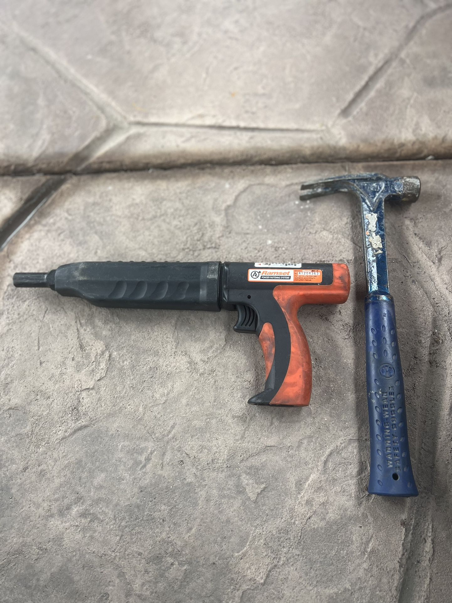Comes with hammer, no charger π single-shot, trigger-operated fastening tool that uses a .22 caliber powder load to drive nails or pins into hard materials. It has an orange and black rubber cushion grip and features an auto-cartridge ejection system.