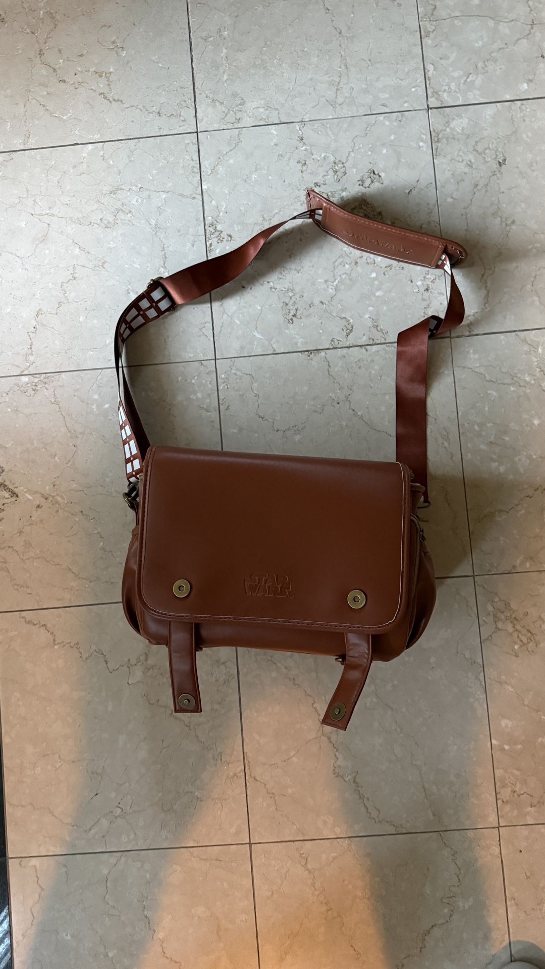 Star Wars Chewbacca camera bag. Camera inserts are customizable. Faux leather finish, inner pocket organization in the front pocket, and adjustable strap that you can detach that resembles Chewbacca’s bandolier. Lightly used.