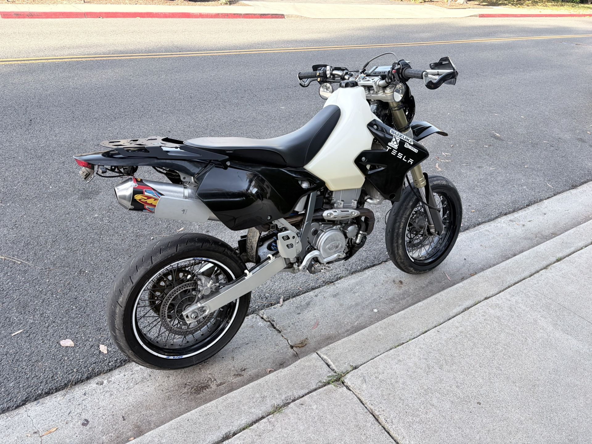 Selling my 2008 Suzuki DRZ 400 SM Bike starts right up every time super clean Very maintained bike I do oil changes every 800 miles Pros Street legal bad ass super moto Runs great 4 1/2 gallon gas tank Comes with original one Comes with a concepts seat super comfortable ($400) I have the original one FMF pipe I have a folder of useful information for the bike And the title Cons Bike will bog sometimes just something in carb Other than the slight bogging issue (which is only happens if you literally go wide open from idol,) everything is 100% Trades?????