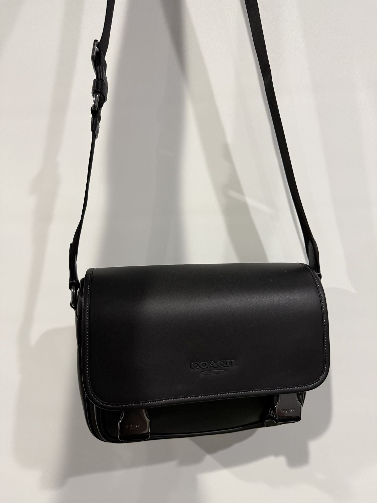 Stylish black leather messenger bag by Coach. Never used. Cash and pick up only.