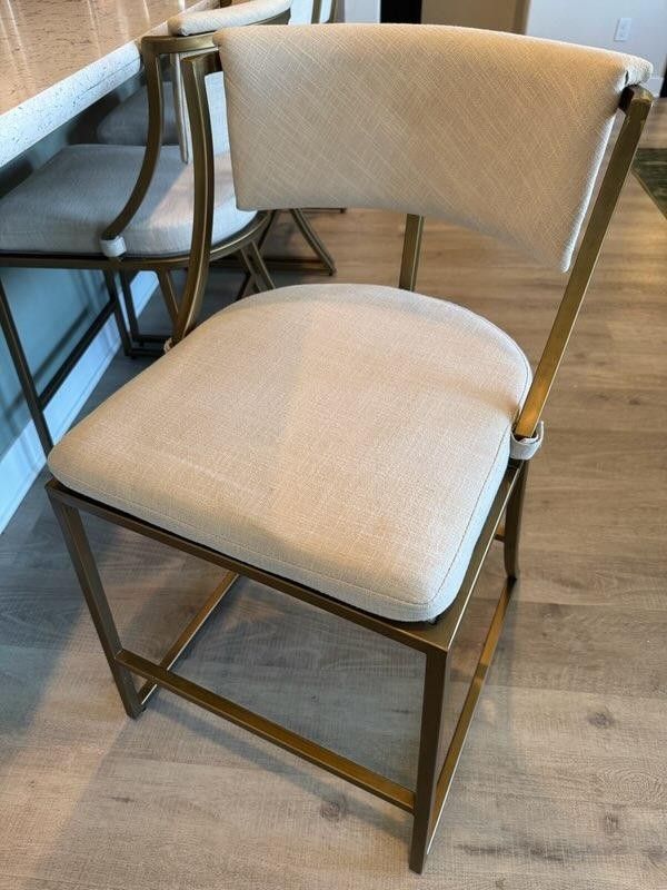 Allister Upholstered Counter Stools – Set of 4 (Excellent Condition) Selling four Allister upholstered counter stools, originally from Ballard Designs. These have a sleek, modern look with sculptural lines that elevate any kitchen island or counter space. Details: - Price: $125 each (or $500 for all 4) - Condition: Great – very well maintained - Upholstered in the USA - Durable metal frame with antique brass finish