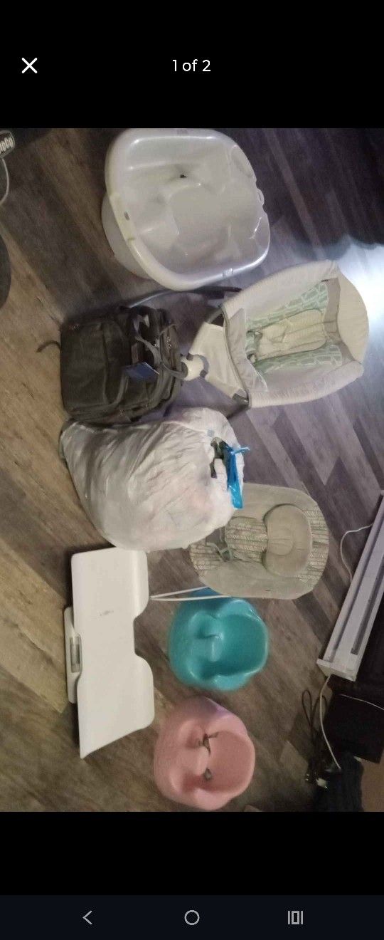 Baby boy bundle Rocker,bouncer,size 3 months and 3/6 months and bucket full of blankets breast pump baby bottles yoga ball and other