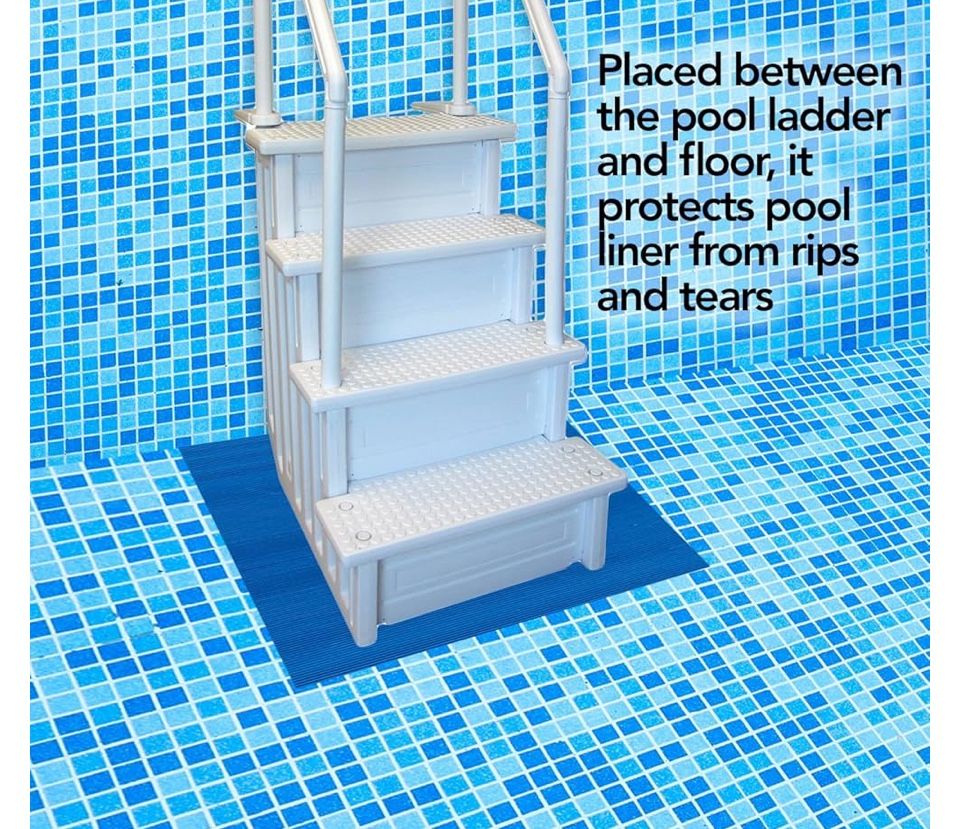 POOL LINER PROTECTION: Placed on the pool floor between the ladder footing and the pool liner, our non-slip pad protects the liner from damage while providing a more stable footing when entering or exiting the pool QUALITY THAT MEASURES UP: Our 36 inch x 36 inch, 0.125 inch thick, powder blue swimming pool ladder mat with v-grooved rubber surface provides safety, comfort, and durability for above ground pools STORES EASY: Made of soft, vinyl resin it is flexible for easy storage, trimmable for custom fitting, and holds up to chlorine ECO-FRIENDLY MATERIAL: Our products use as much recycled materials as we can to maintain product quality so you can be sure that we are caring for the environment; Does not contain any Prop 65 regulated contaminants