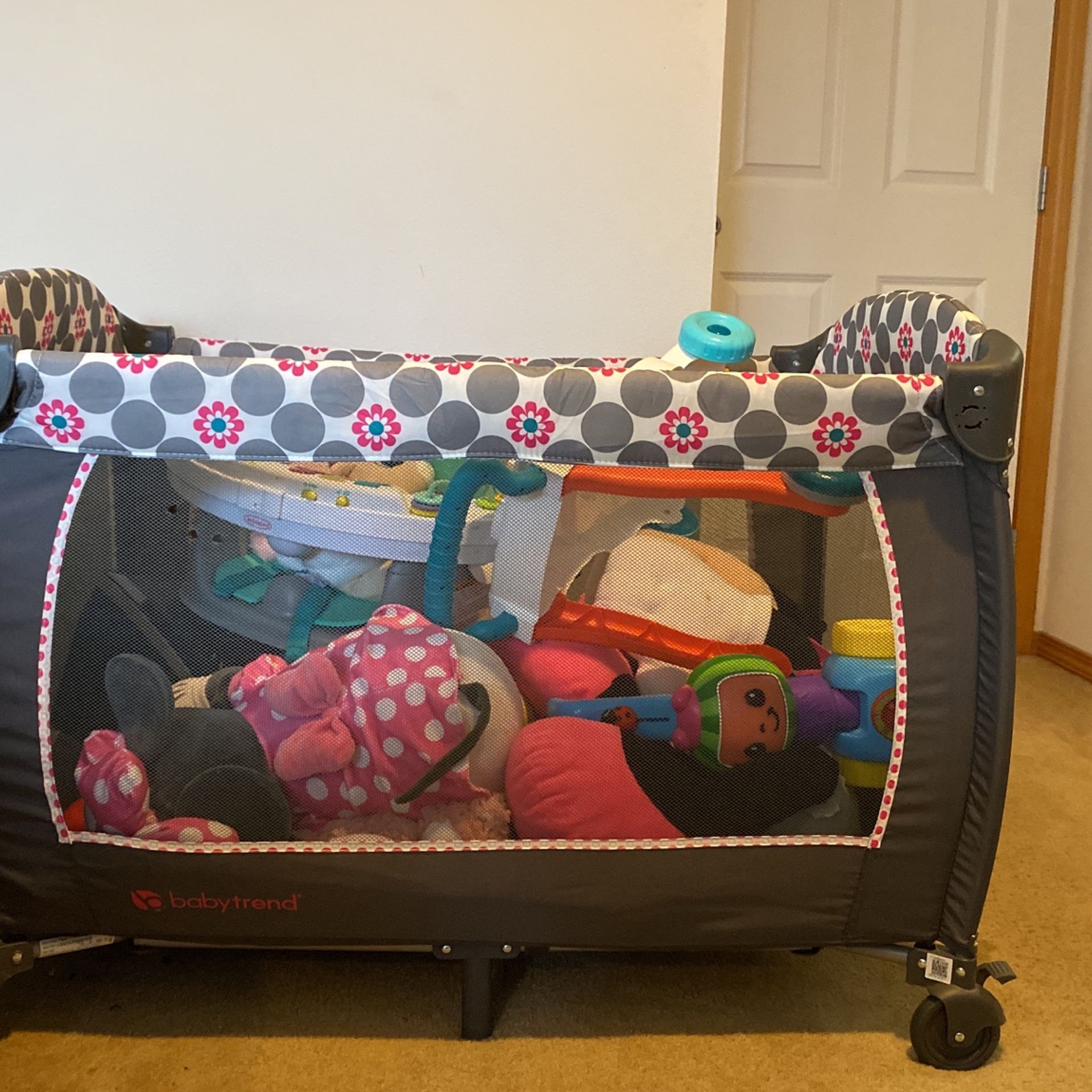 Used a couple times. Comes with changing table accessory , and little bassinet.