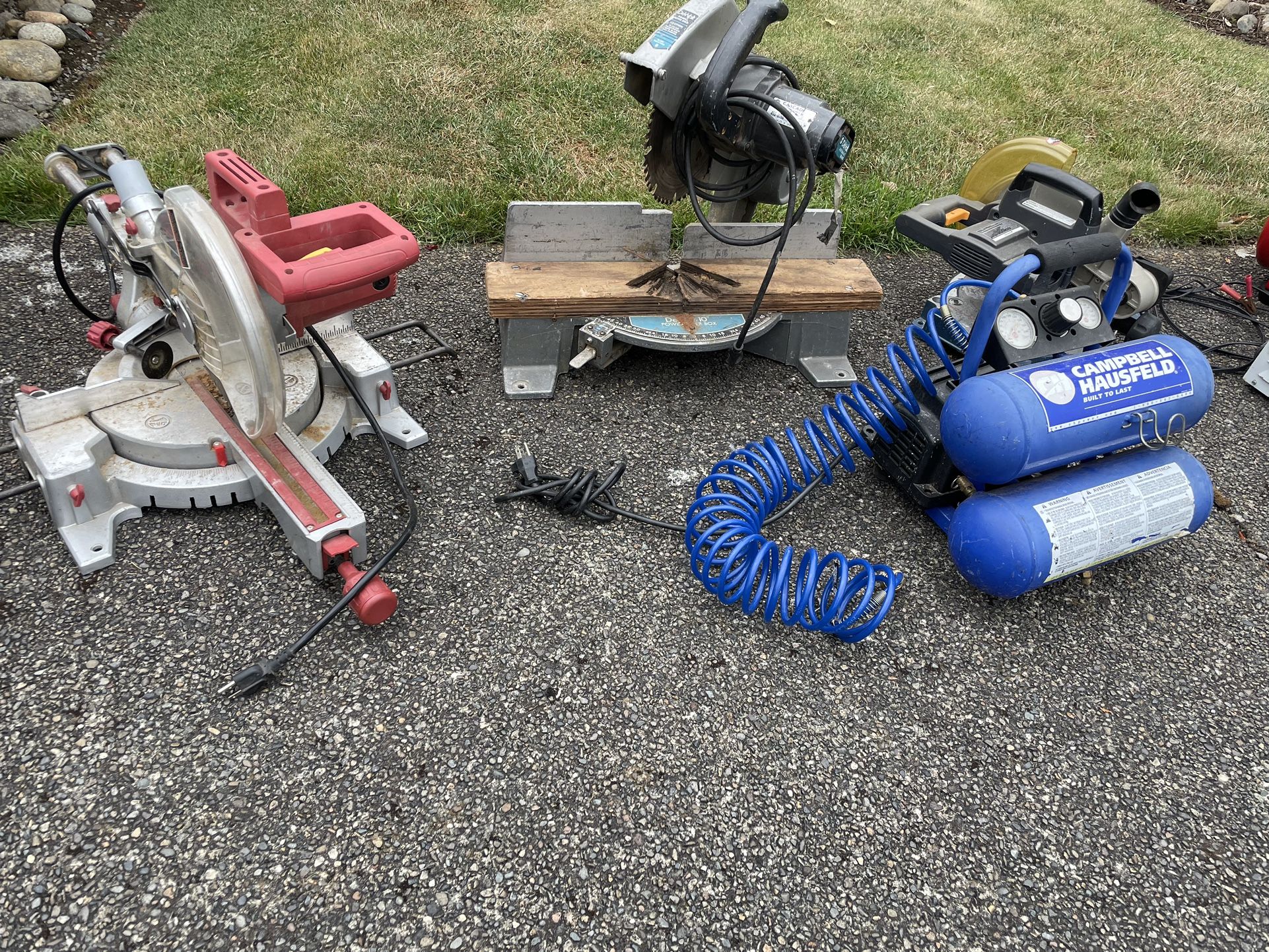 Mix of batteries Handtools Air compressors Saws GARAGE SALE . * Price varies per item *