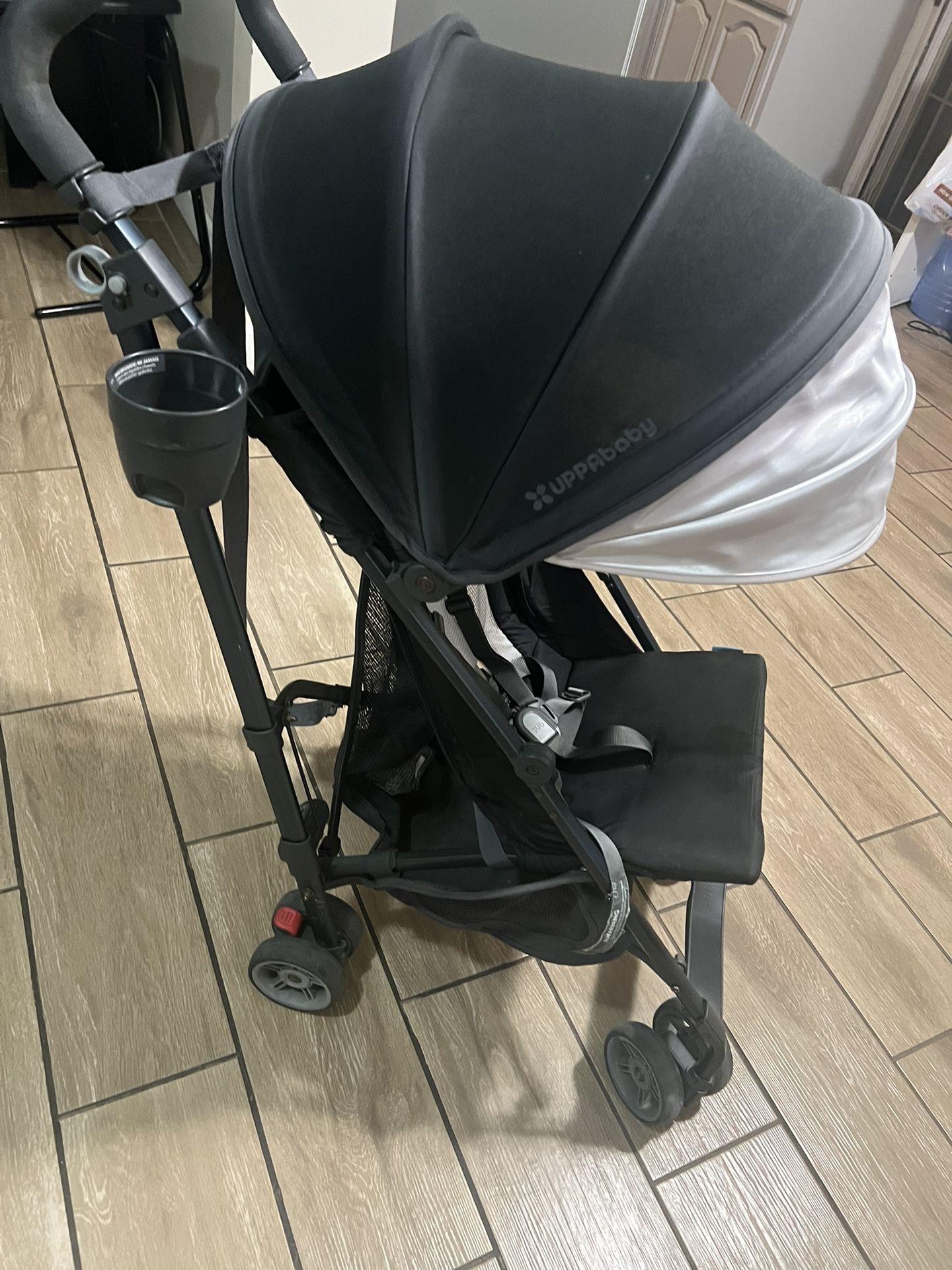 Black UPPAbaby stroller with an extendable sunshade. Has a cup holder and adjustable harness. Storage basket underneath. Good condition. $40 pick up in paramount