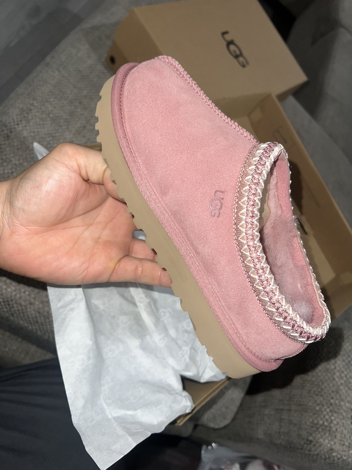 Brand new Ugg slides. Nobody has these in store so I ordered them online but got the wrong size. Return process is a hassle online. Have not been worn at all.