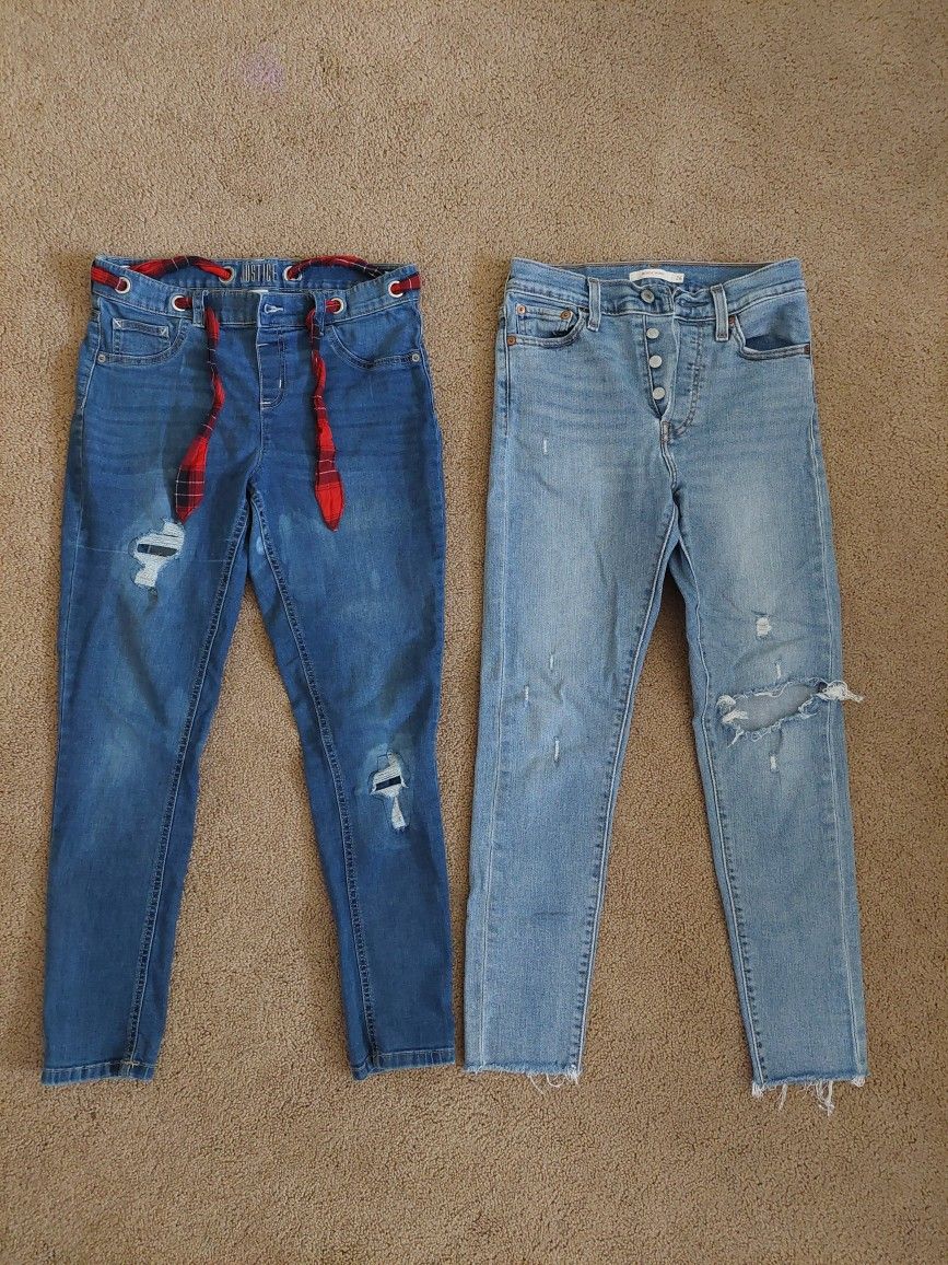 Both for $25. In excellent condition. For ages 12-14 roughly Dark blue: Justice Size 14 plus Light blue: Levi's Size 26 (waist size) Pet/ smoke free home