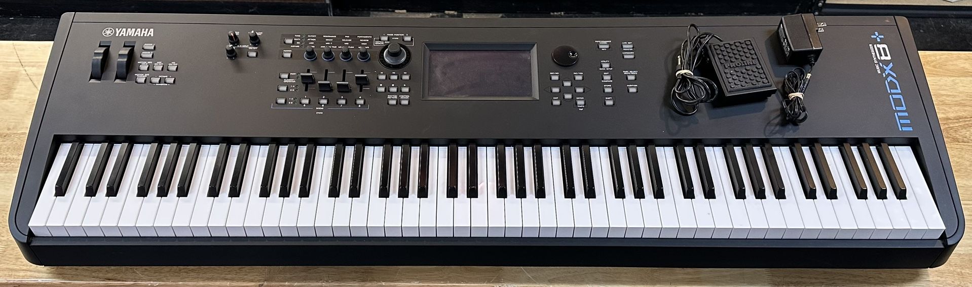 - Used - - Yamaha MODX M8 Plus 88-key Performance Synthesizer Keyboard - - Includes Proline PSS10 Pedal - - Advanced 88-key - Fully weighted - Graded hammer-action keybed - 3 sound engines - Comprehensive control set - Motion Control Synthesis system - Motion Sequences, the Super Knob, Envelope Follower, and more - AN-X engine - 2 filters, 10 filter types, pulse-width modulation, oscillator self sync, ring modulation, frequency modulation, wave share, and variable voltage-drift and aging parameters -GHS Keyboard (Initial Touch) - Motion Control Synthesis Engine - AMW2 Engine: 8 Elements - FM-X: 8 Operators, 88 Algorithms - AWM2 Engine: 128 (max. stereo/mono waveforms) - FM-X: 128 (max.) - Preset: 5.67 GB (when converted to 16-bit linear format) - User: 1.75 GB - 2,227 Preset Performances - HD instrument sounds with up to 128 Elements per Part - Top-panel control layout - 8 physical faders - 6 dedicated display knobs - Dedicated Part and Scene buttons - Color touchscreen - USB/MIDI 2.0 - 10 x 4 audio interface provide MIDI and multitrack audio recording - Virtual instrument monitoring via a single USB - Expanded Softsynth Plug-in (ESP) replicates MODX M8 in your DAW - FL/D/D23-I44-6147-FJJ