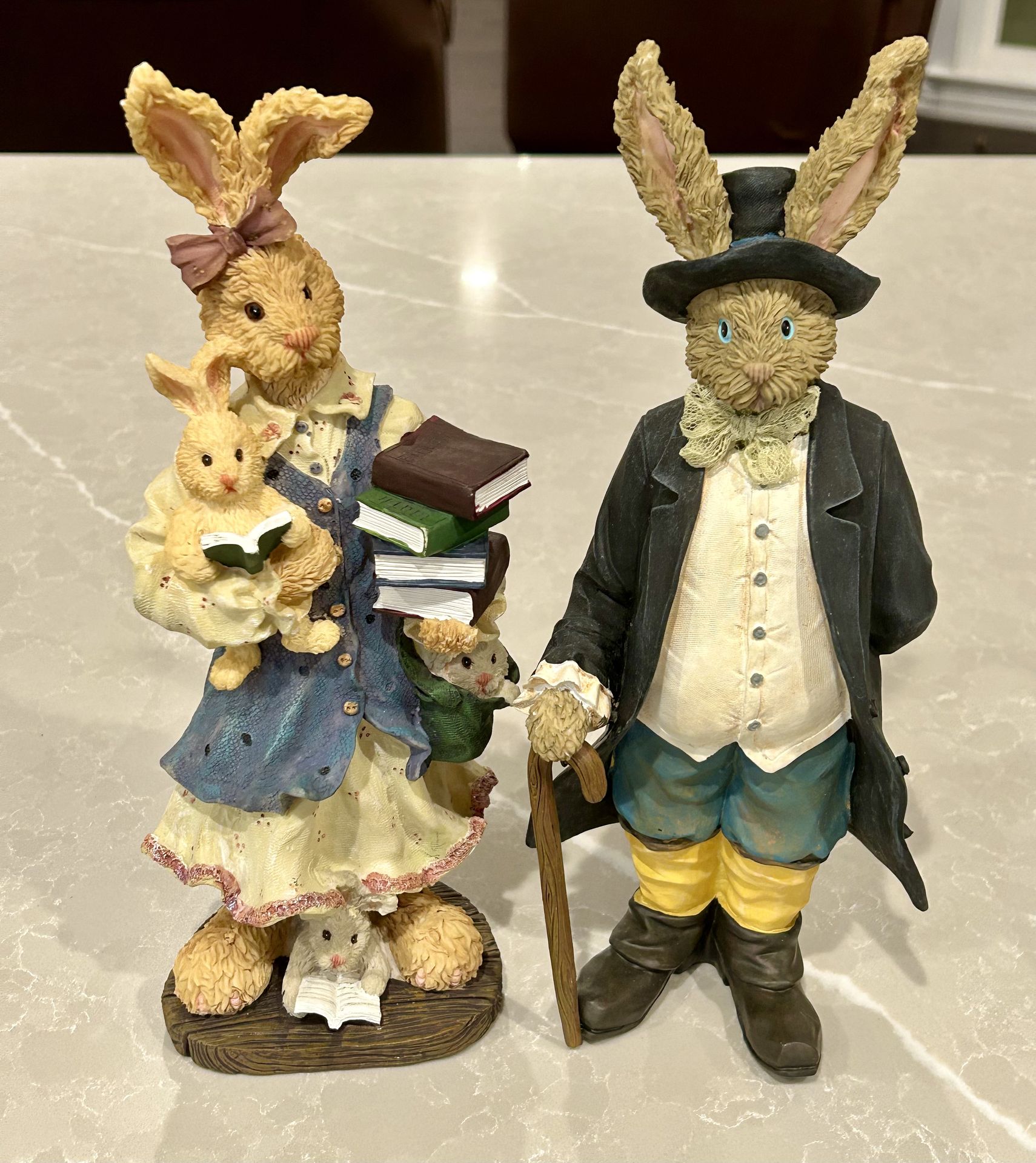 Exquisite and highly detailed carved resin Easter Rabbit figurines. Dapper Rabbit is holding a bouquet of flowers and Mother Rabbit is reading with her three babies. Each is hand painted and in excellent condition. Dimensions are 12”h x 5”w x 4”d and 11.5”h x 5”w x 4”d