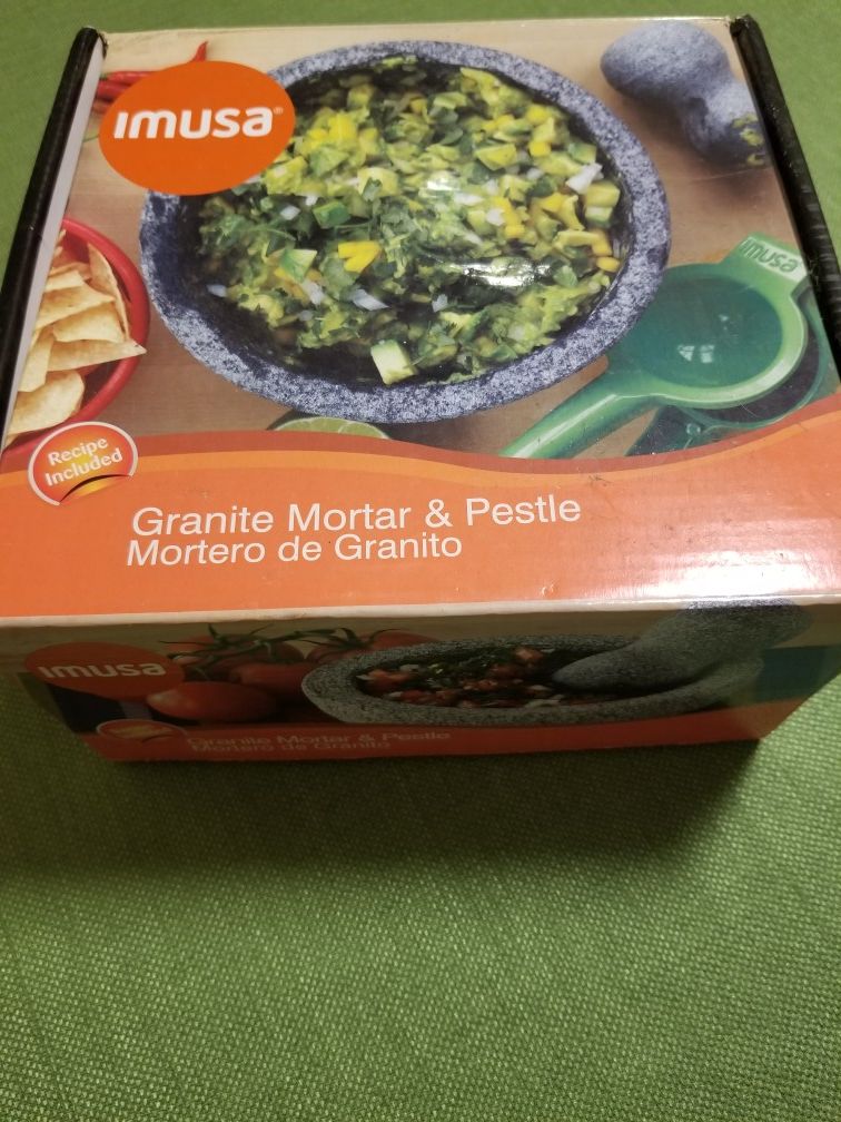 Brand New! In box, granite mortar and pestle. Large and heavy. Great for guacamole!