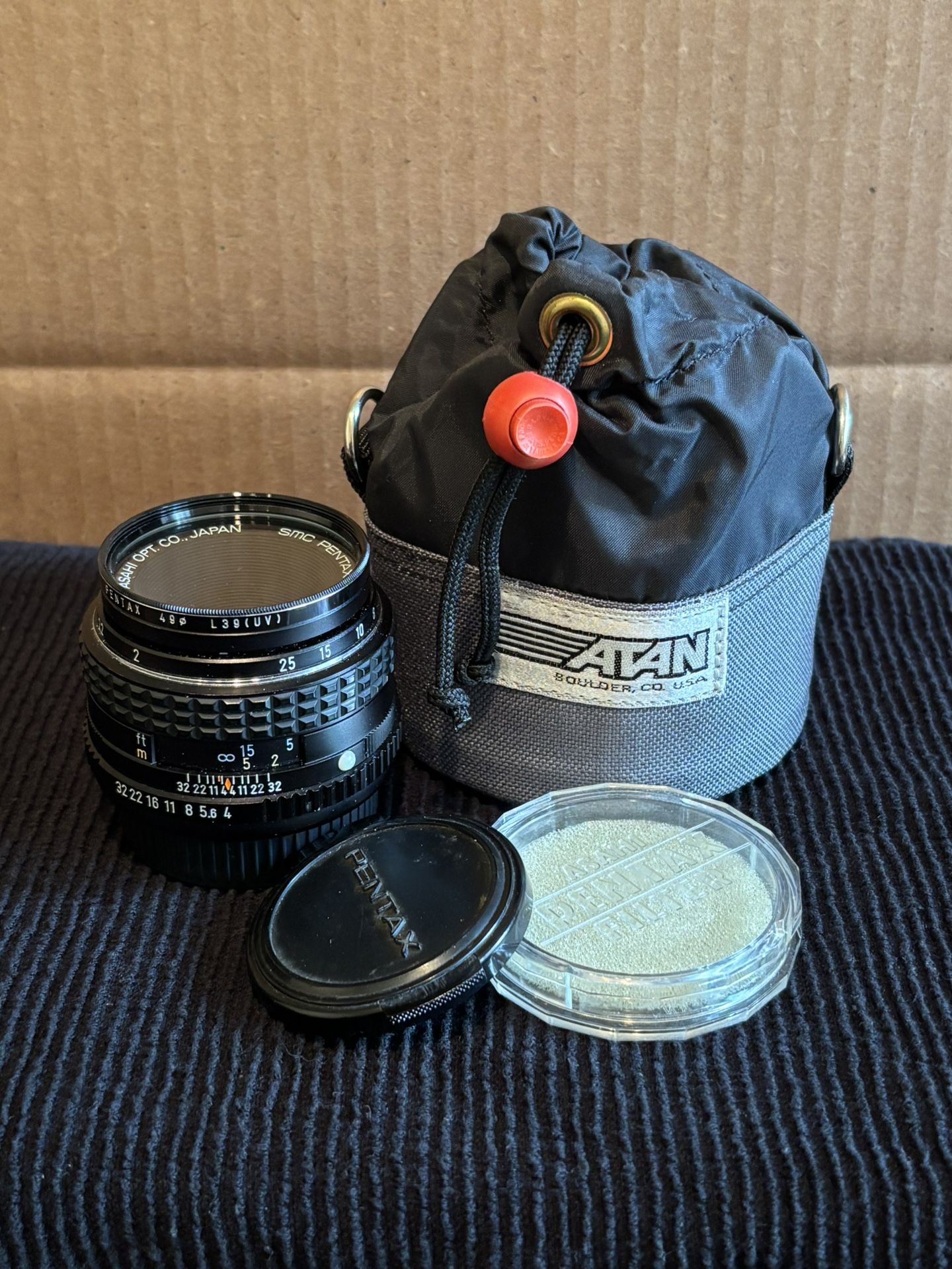 Hard to find Pentax M series macro lens. This lens is in mint condition, no mold or haze. Still has gold inspection sticker on it! Includes original Pentax UV filter and jewel case. Also including a very nice Atan lens case.