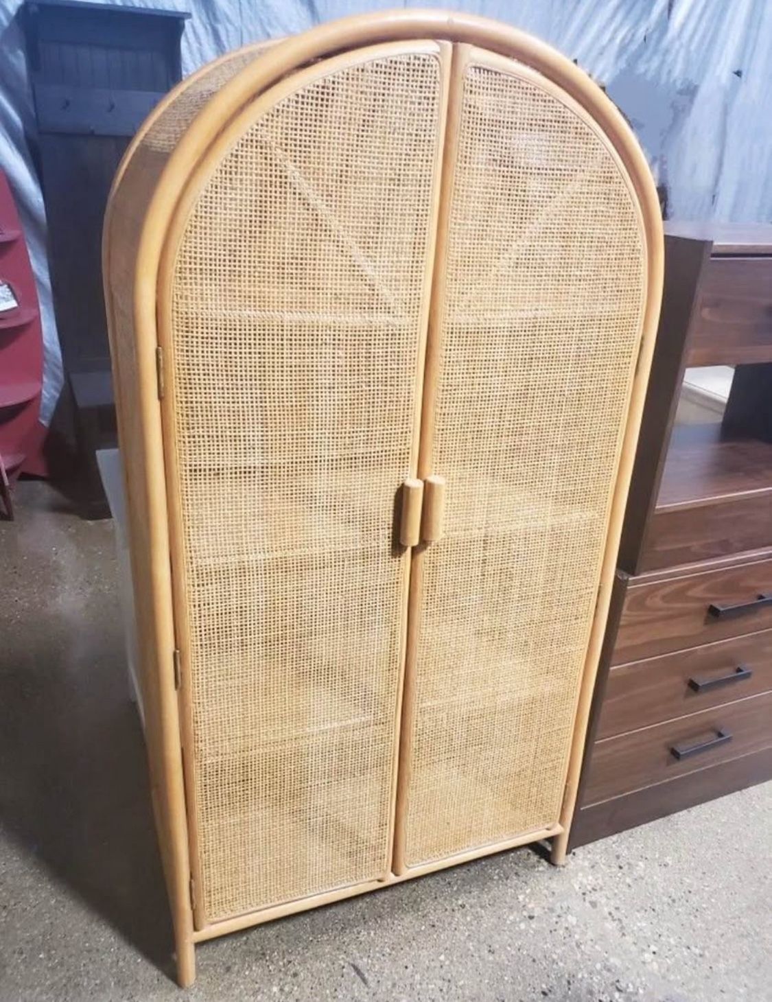 New Boho Japandi Rattan Storage Cabinet * Dimensions: 59.5” H x 31.5” W x 16.7” D * 4-shelves behind the doors * Elongated wood handles * Woven natural rattan embellishments * Rounded silhouette * Fully assembled * Verified Trusted Seller / Read/ See My Reviews! Follow Me For Amazing Deals Listed Daily!