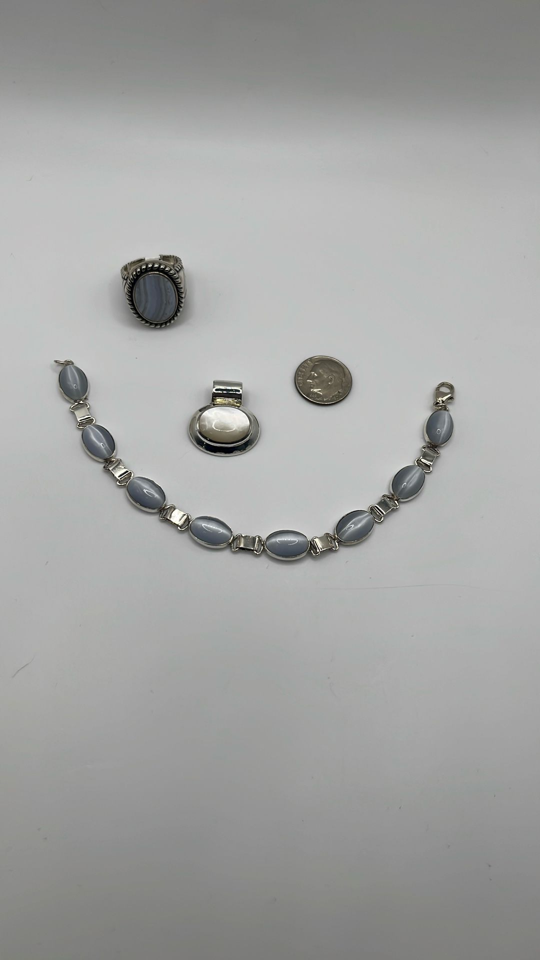 All 3 pieces sold separately. Pendant 5.1 grams opal $25 White stone ring 12.3 grams 6 1/4” $45 Stone bracelet 13.9 grams 7” $75