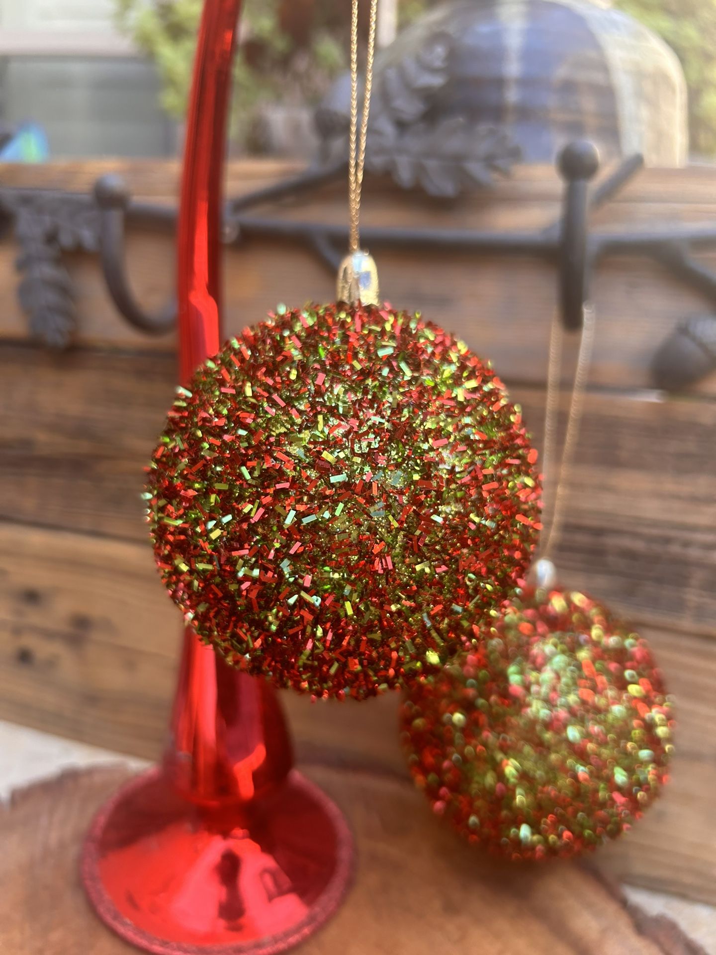 Set of 2, Round Ball Glitter Ornament Red Green 3-3/4” Tall G