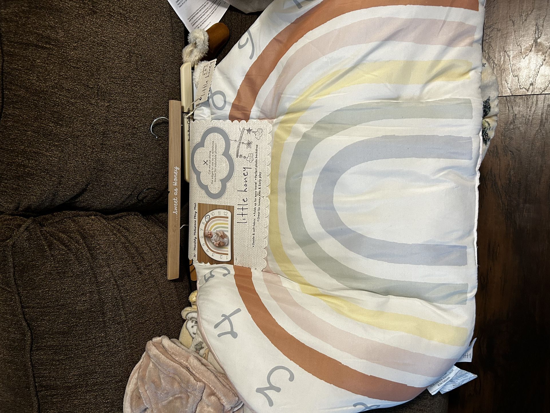 5 $ each brand new blankets , a winnie the pooh swaddle, a month to month rainbow mat