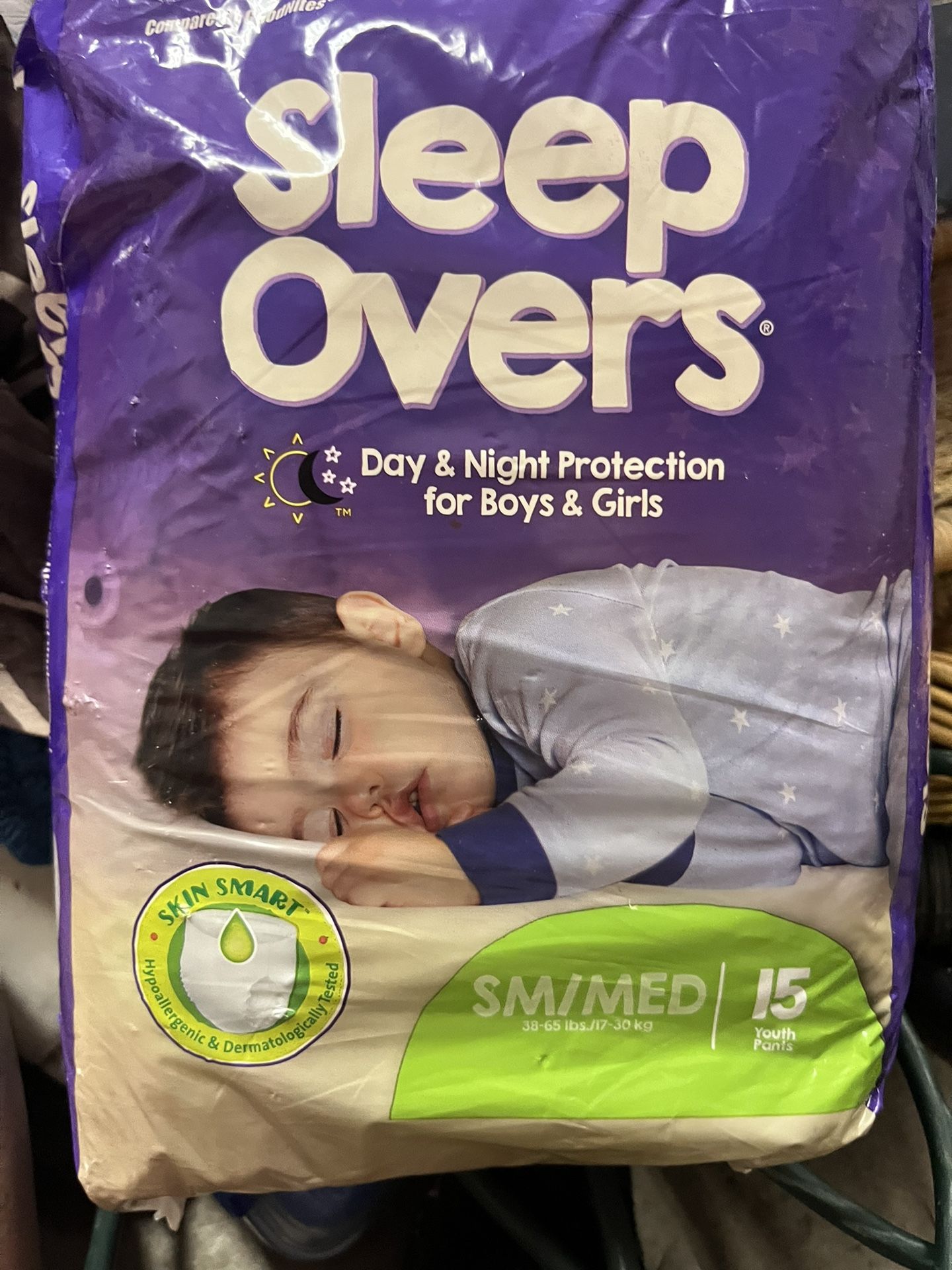 S/M Walmart brand Pull-Ups for nighttime. 38-65lbs. I have 3 packs for sure, maybe 4. Selling all for $20 total.
