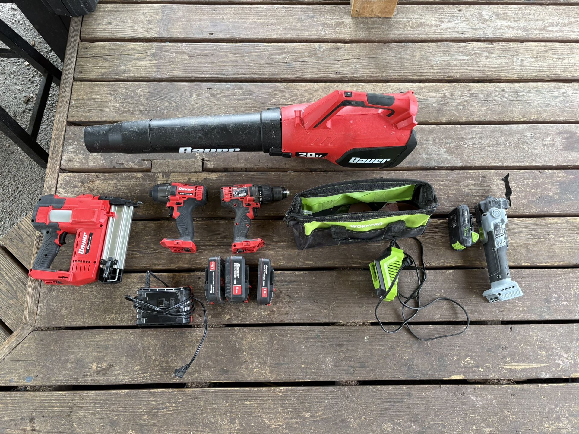 Leaf blower, 18ga brad nailer, drill, 1/4” impact driver with batteries and charger. Oscillating multi tool with blades, bag, accessories, battery, and charger. Upgrading my tools. Don’t need these anymore. Everything works. Batteries hold a charge.