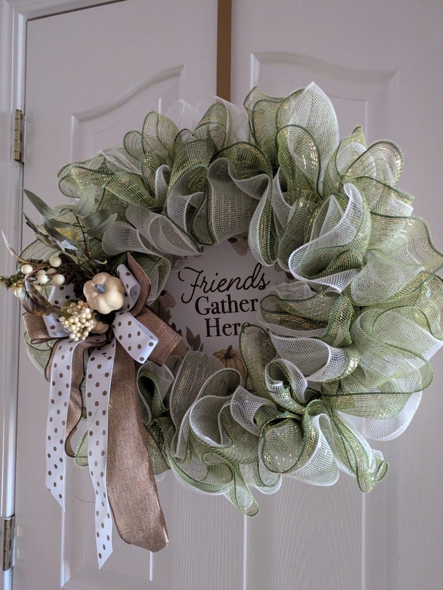 This wreath is made from a deco mesh in shades of green and white adorned with a bow. A miniature white pumpkin for added embellishment. Great for the front door