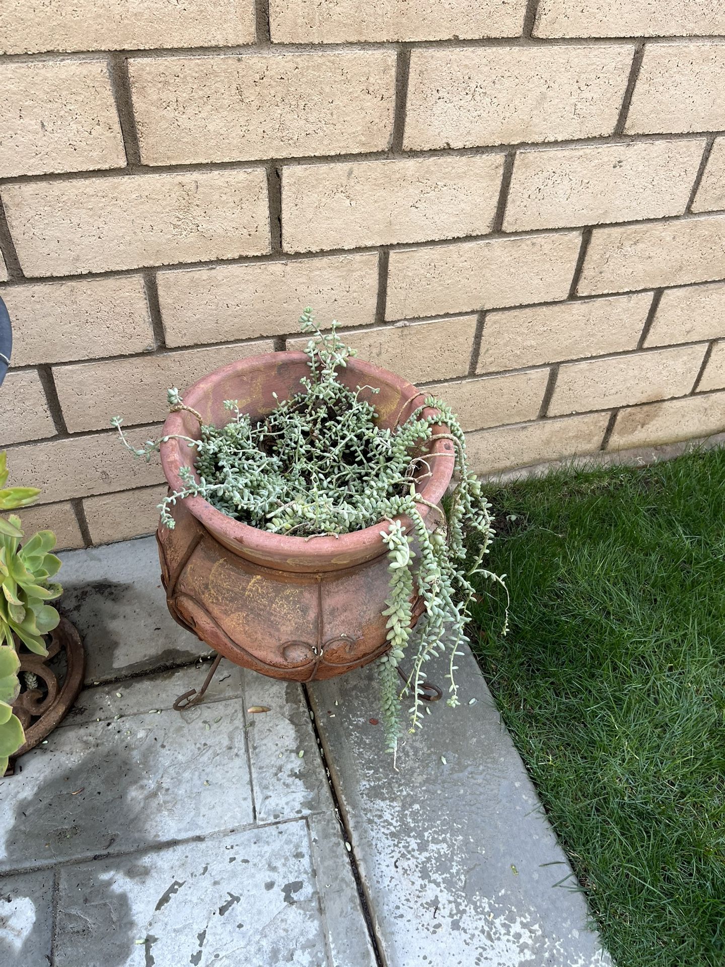 2 very heavy clay pots with succulents, 21” tall Could use clear coat to keep from deteriorating $40 for both