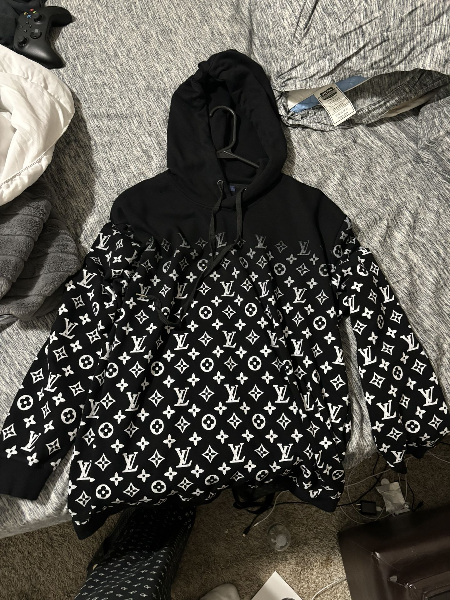 Black hoodie with white faded up logo and tag. Brand new. It is rep. Good quality thick sweater with logos. Open to possible trades or negotiation. Just feel free to send me a message and we can discuss