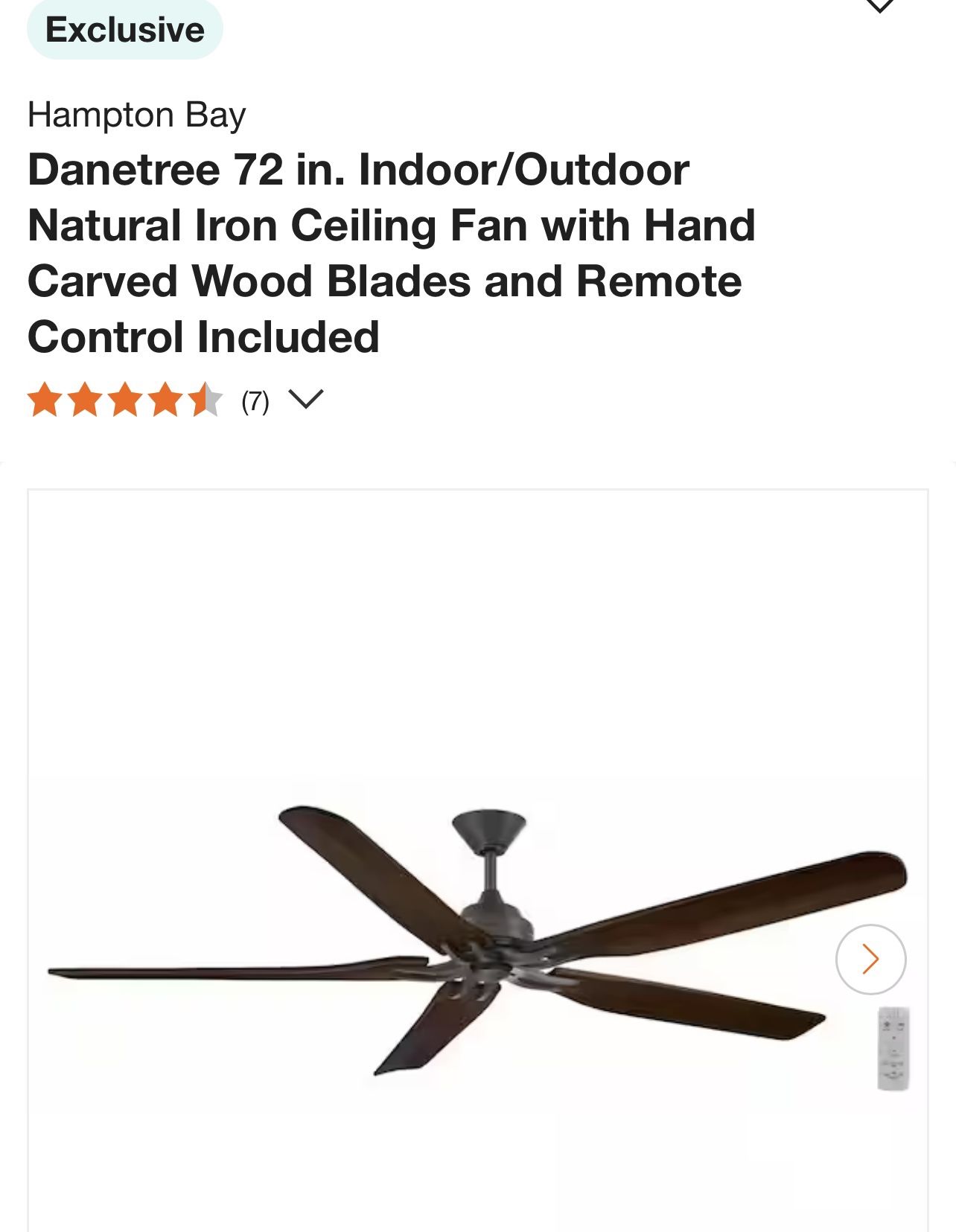 Hampton Bay Danetree 72 in. Indoor/Outdoor Natural Iron Ceiling Fan with Hand Carved Wood Blades and Remote Control Included.