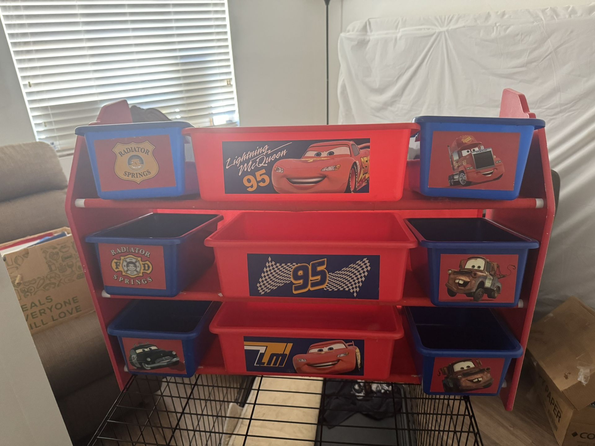 Cars themed toy storage. Perfect for a little boy. Normal wear and tear.