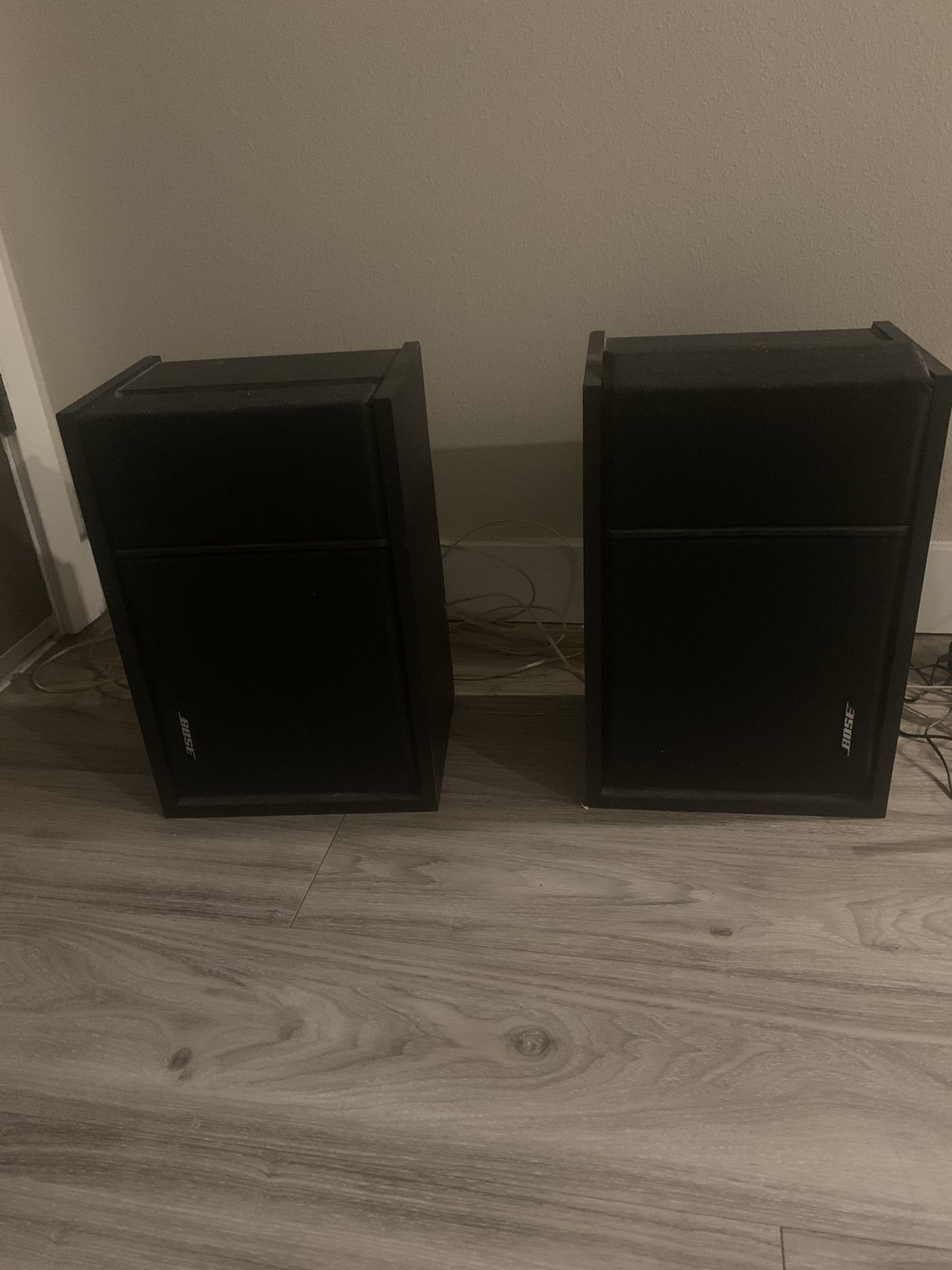 2 black Bose Speakers. Used but in excellent condition. One speaker’s fabric has started to peel back a little bit but functionality is unaffected. Speaker wire is included