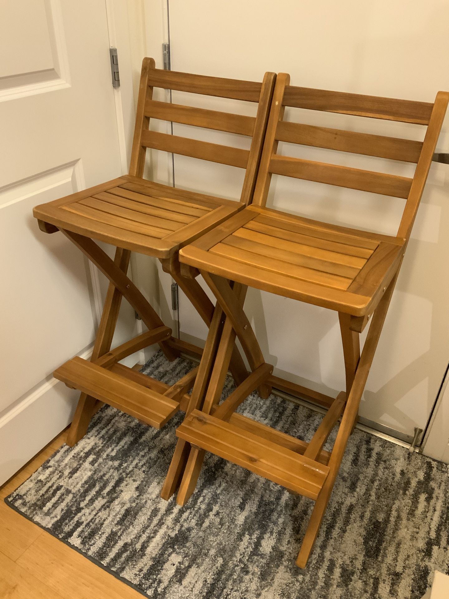 About this item: Includes: Two (2) Barstools Materials: Acacia/Teak Wood No Assembly Required | Foldable For Easy Storage | Sturdy Construction Dimensions: 21.50 inches deep x 15.00 inches wide x 41.25 inches high | Seat Dimensions: 13.50 inches deep x 15.00 inches wide x 30.75 inches high
