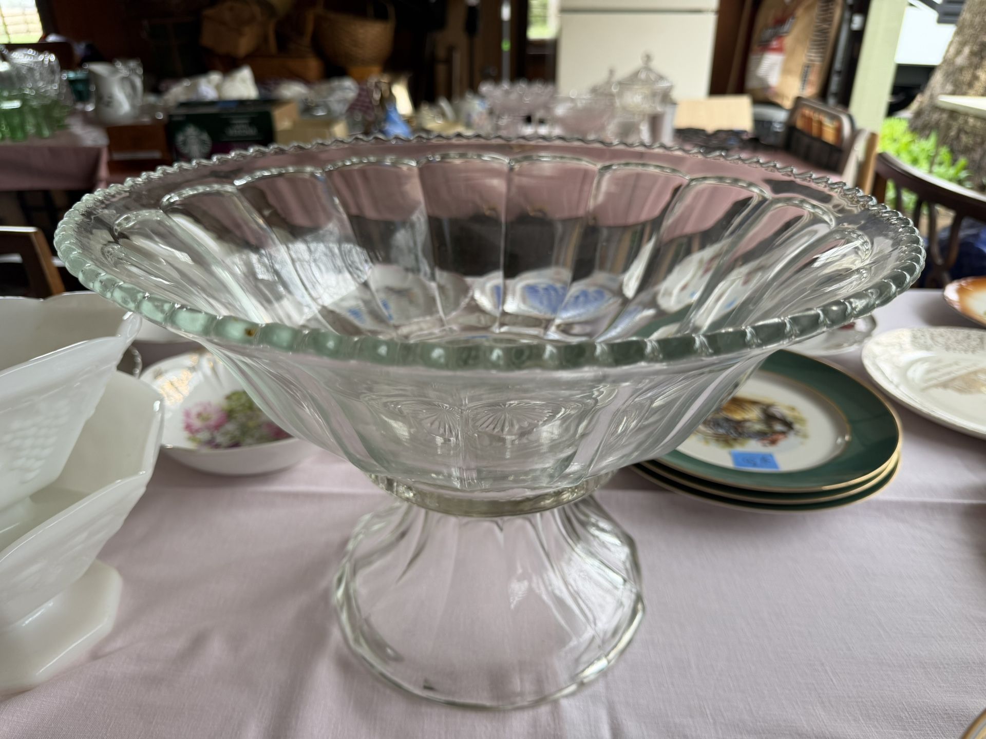 Depression era punch bowl on pedestal (2) pieces 16” diameter and 11” height.