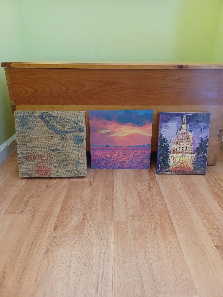 Three wall decor items, all unique. Box-like burlap covered with sandpiper deign 12x12, acrylic original painting 12x12, and textured oil painting depicting capital in DC, 12x8. 2 dollars each or all for 5.