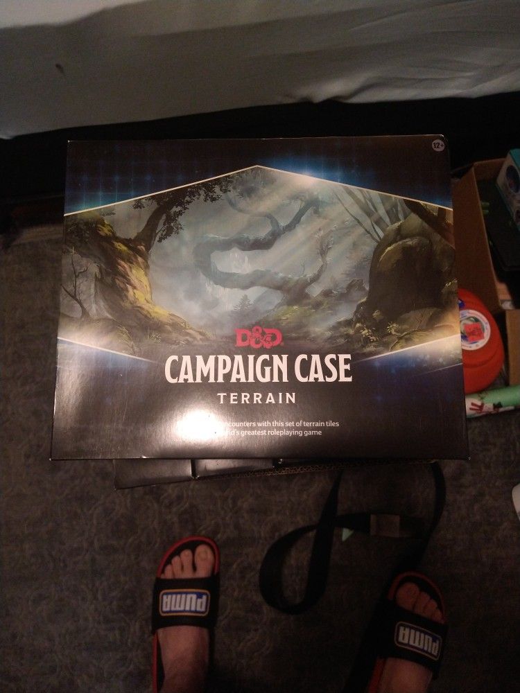 D&D Campaign Case- Terrain. 30 terrain tiles, one double sided play surface, folder of 5 terrain cling reusable stickers. Case is sealed with a magnetic flap and has a rope carrying handle.