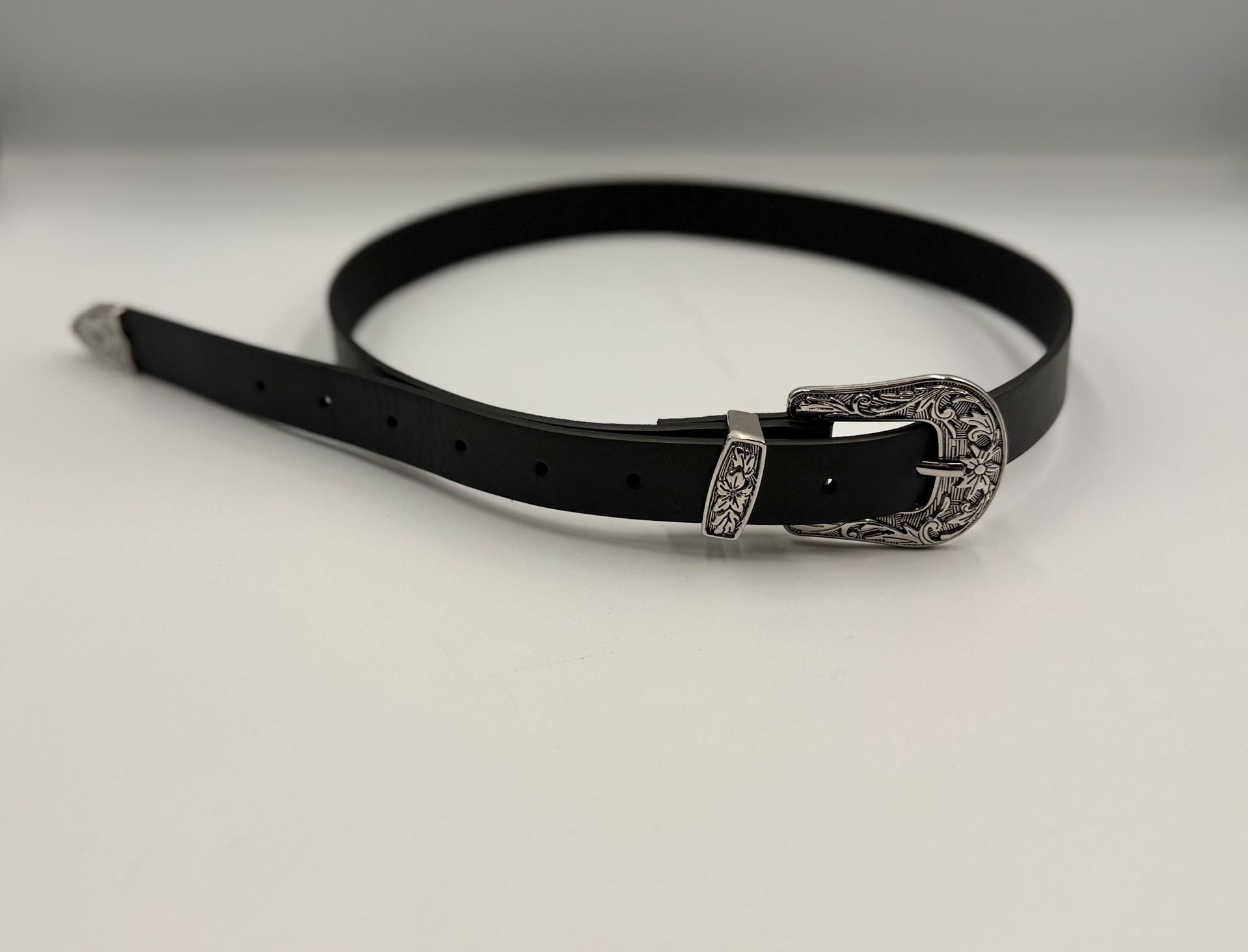 Vintage 90s western-style belt featuring smooth black faux leather and an engraved silver-tone floral buckle and keeper. Classic country-inspired accessory, adjustable fit, approx. 41.5” length.
